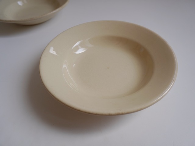 フランスの地厚スーププレート。プーリアの陶器のようなこっくりとしたベージュは、おおらかで暖かみがあってなんとも良い雰囲気。 ビストロ或いは修道院や宿舎などで使うために作られた厚みのある丈夫なつくり。ぽってりとした見た目のかわいらしさが人気ですが、なかなか見つからない珍しい品でもあります。 モーニング、ランチ、ディナーまで1日を通して何度も活躍するシンプルでプレーンな無地のプレート。地厚でタフな品ですので是非毎日お使いいただけたら。 エッジにぽつぽつと染まりが見られますが、この枯れた雰囲気がたまらない!と、むしろそこを気に入って買い付けました。 φ23.0 × H4.8cm 当店で扱っている品物は、アンティーク、ブロカント、ヴィンテージ、古道具、骨董品等の古い品になります。使い込まれた古傷や経年変化こそが古物の魅力だと感じ、買い付けをしております。特に目立つ傷や汚れは画像と説明で記しますが、記載されていない小さな傷汚れはあるものだとあらかじめご了承いただいた上でお買い上げいただきますようお願い申し上げます。破損品以外の返品交換は一切受け付けておりませんので、ご注意ください。