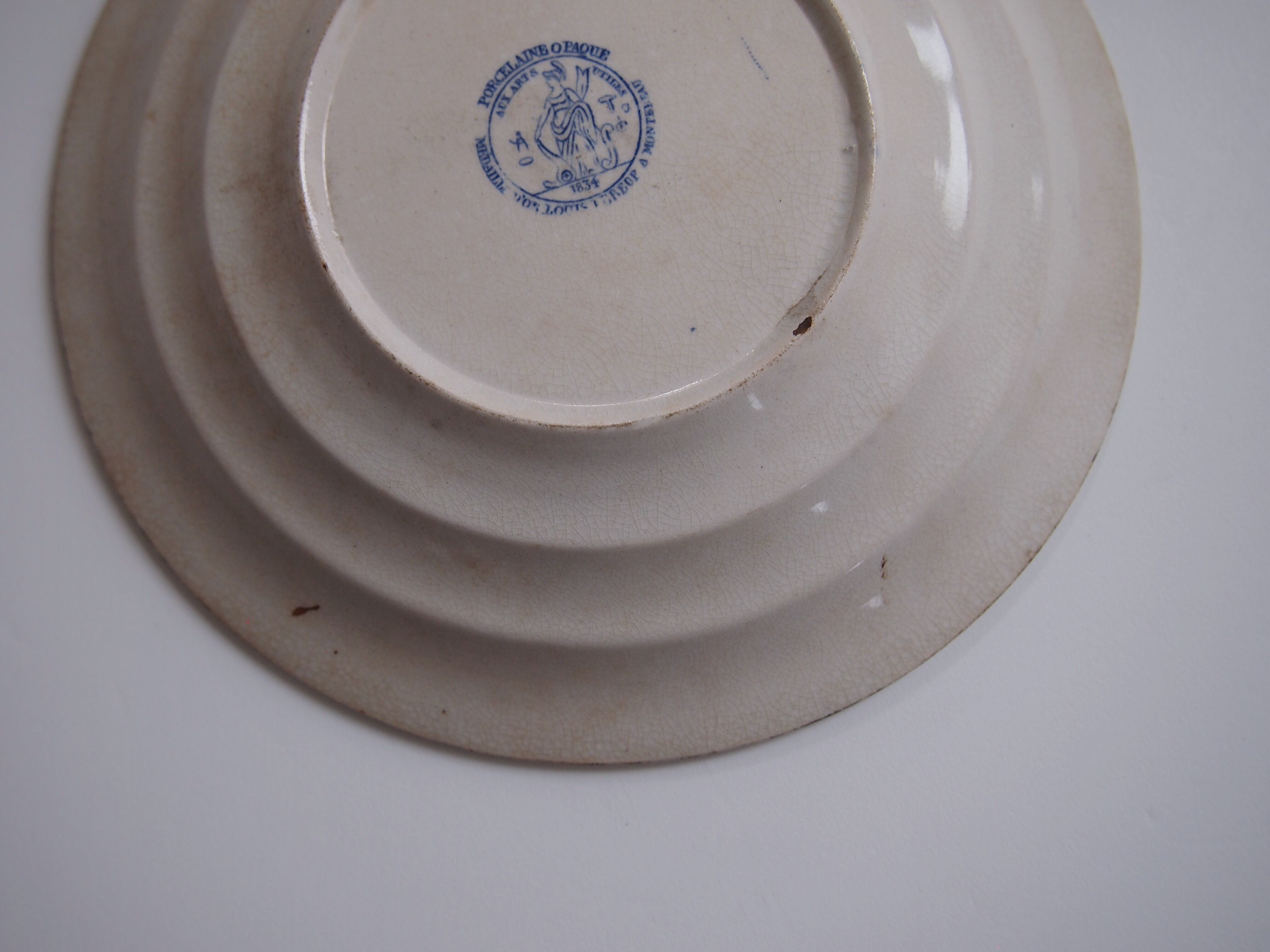 フランス Montereau(モントロー)の絵皿。1834-1840年頃に作陶されたモントロー単独刻印のファイアンスフィーヌです。