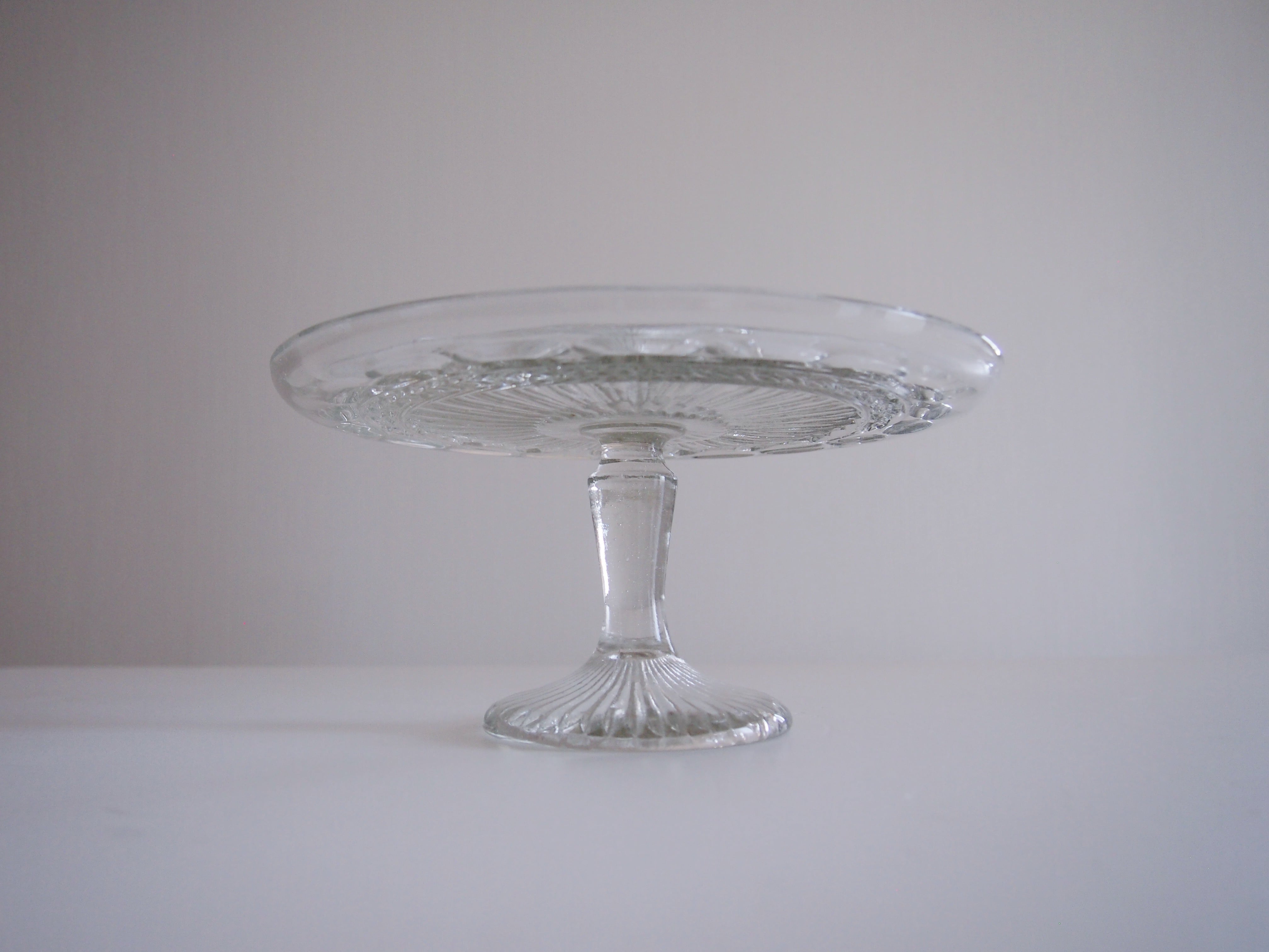 フランスの古いガラスのコンポティエ。フラットなケーキスタンドタイプ。20cm以下のケーキが載せられます。