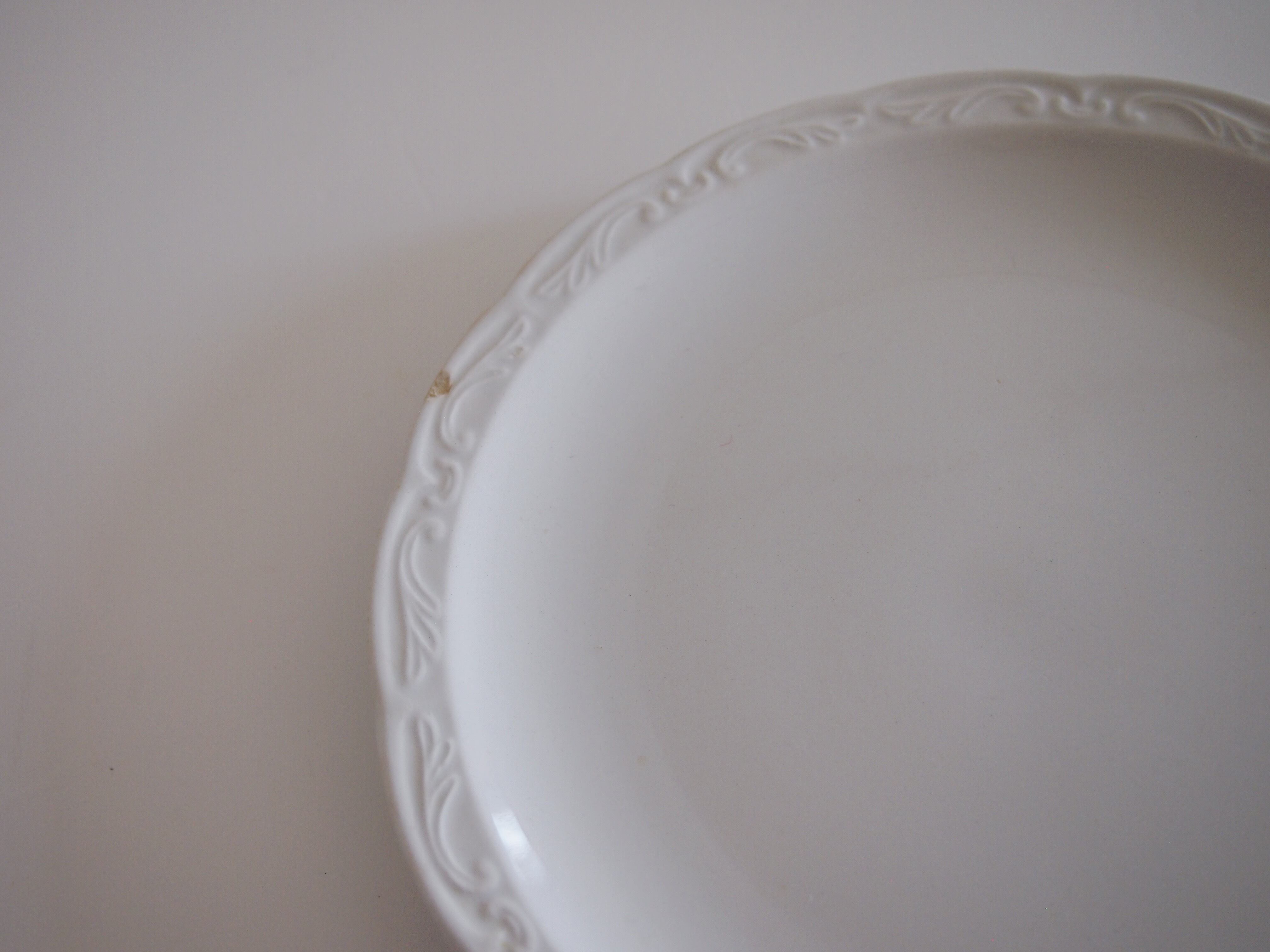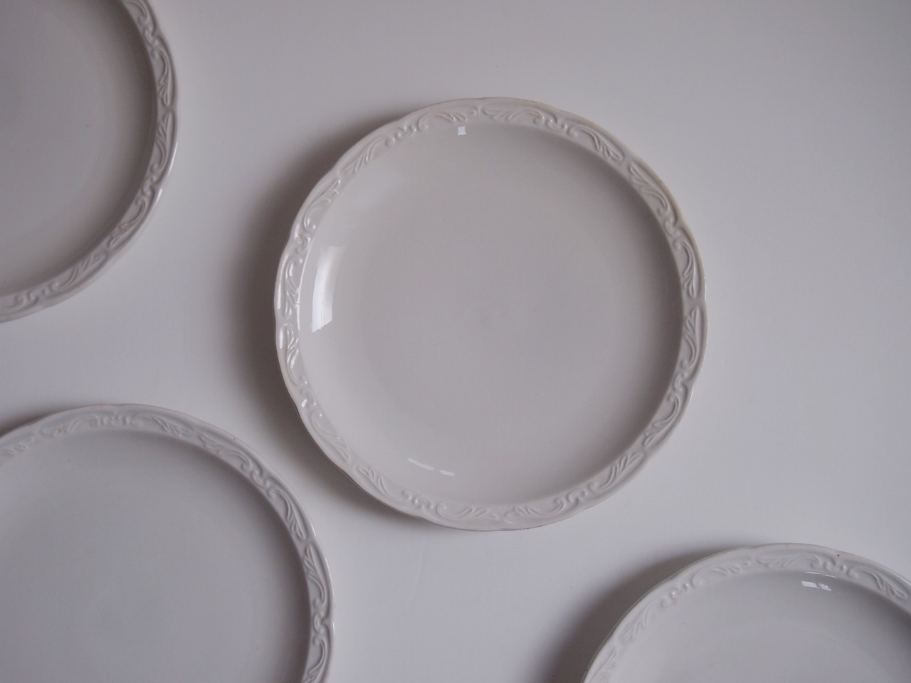 フランス sarregumines(サルグミンヌ)のデザートプレート。シンプルなデザインながらも、リムに施されたレリーフの陰影が美しく、すっきりと華やかな一枚です。