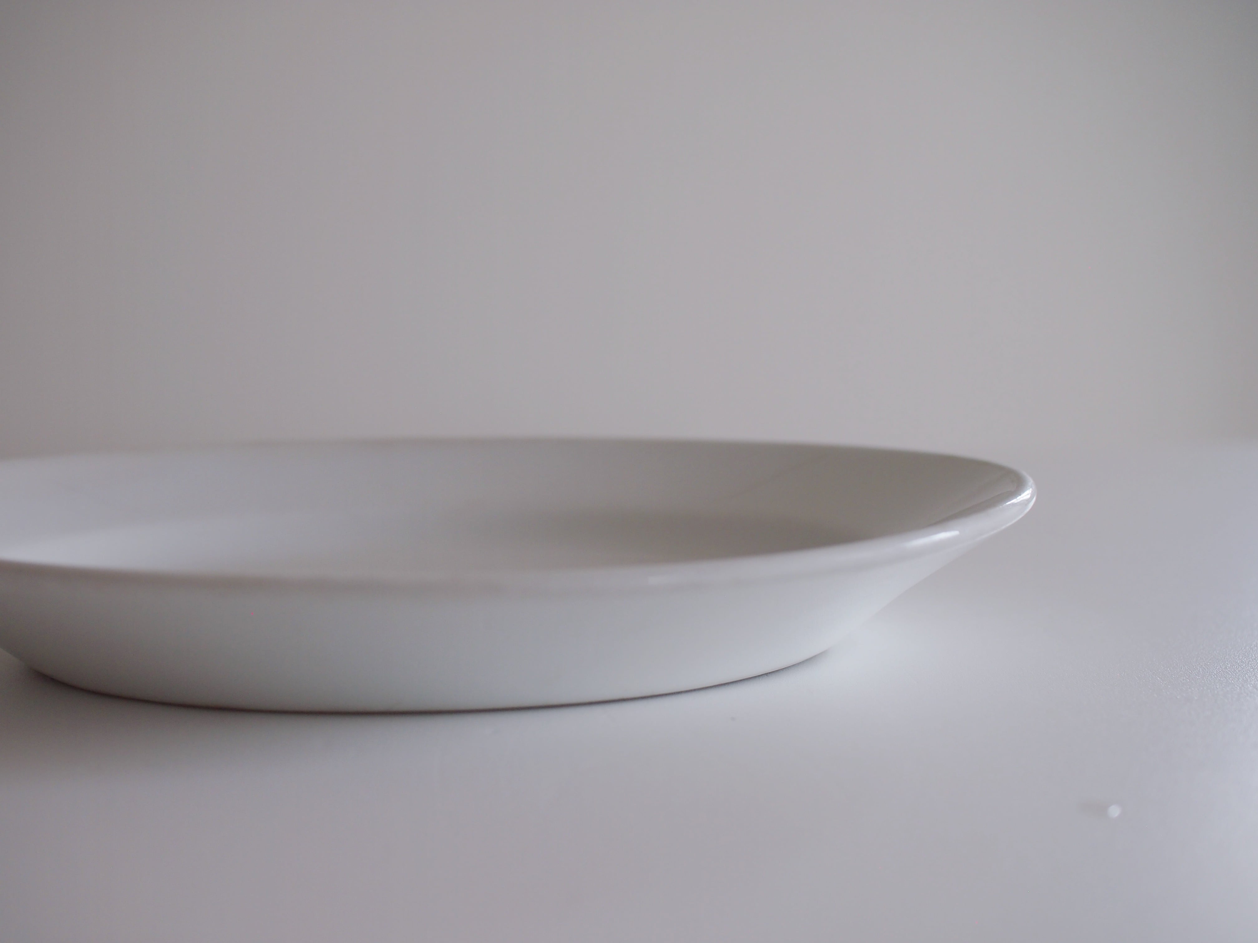 ぽってりとした白い地厚のオーバルプレート。ビストロ或いは食堂などで使うために作られた厚みのある丈夫なつくりです。窯元は不明。