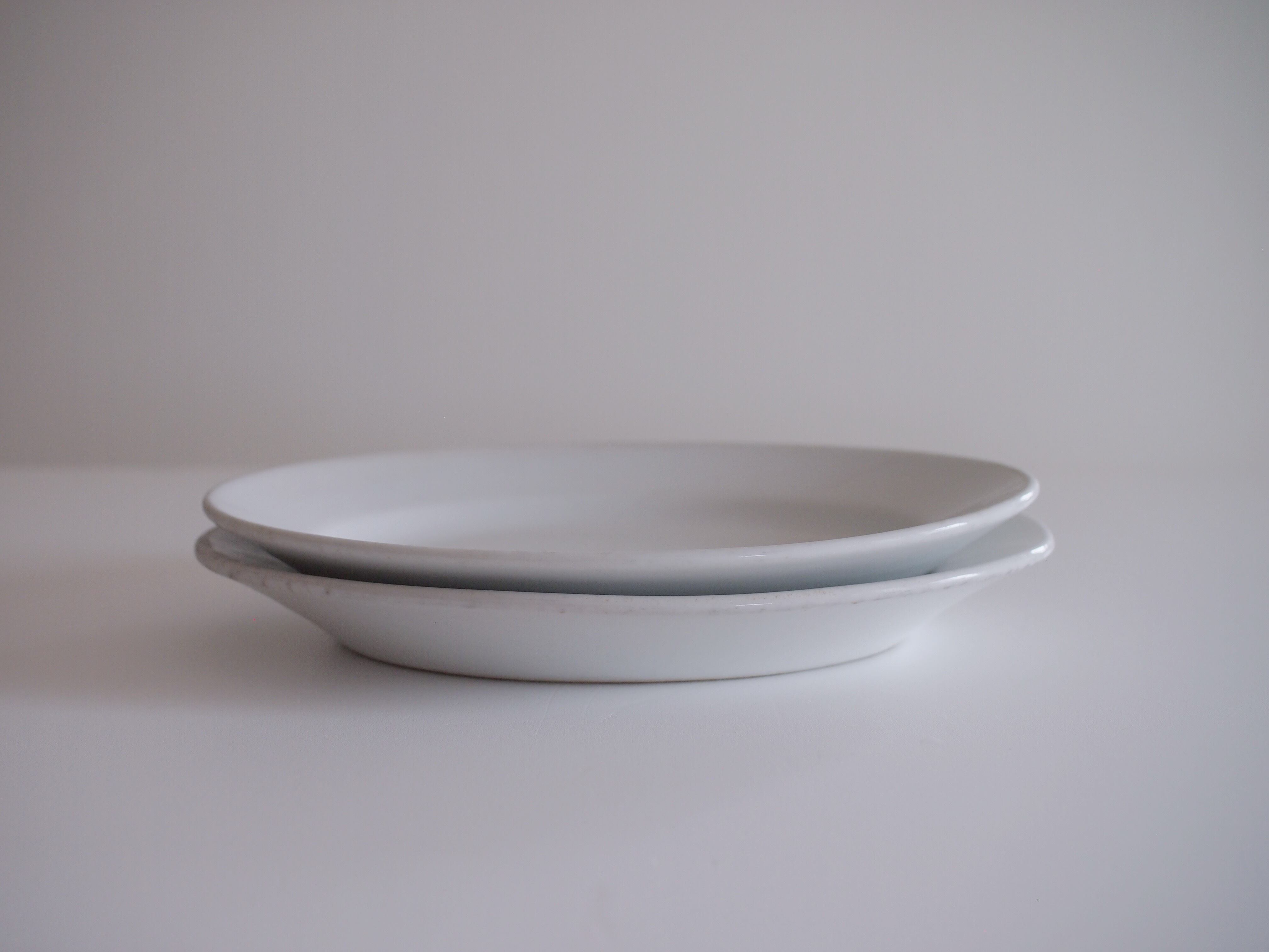 ぽってりとした白い地厚のオーバルプレート。ビストロ或いは食堂などで使うために作られた厚みのある丈夫なつくりです。窯元は不明。