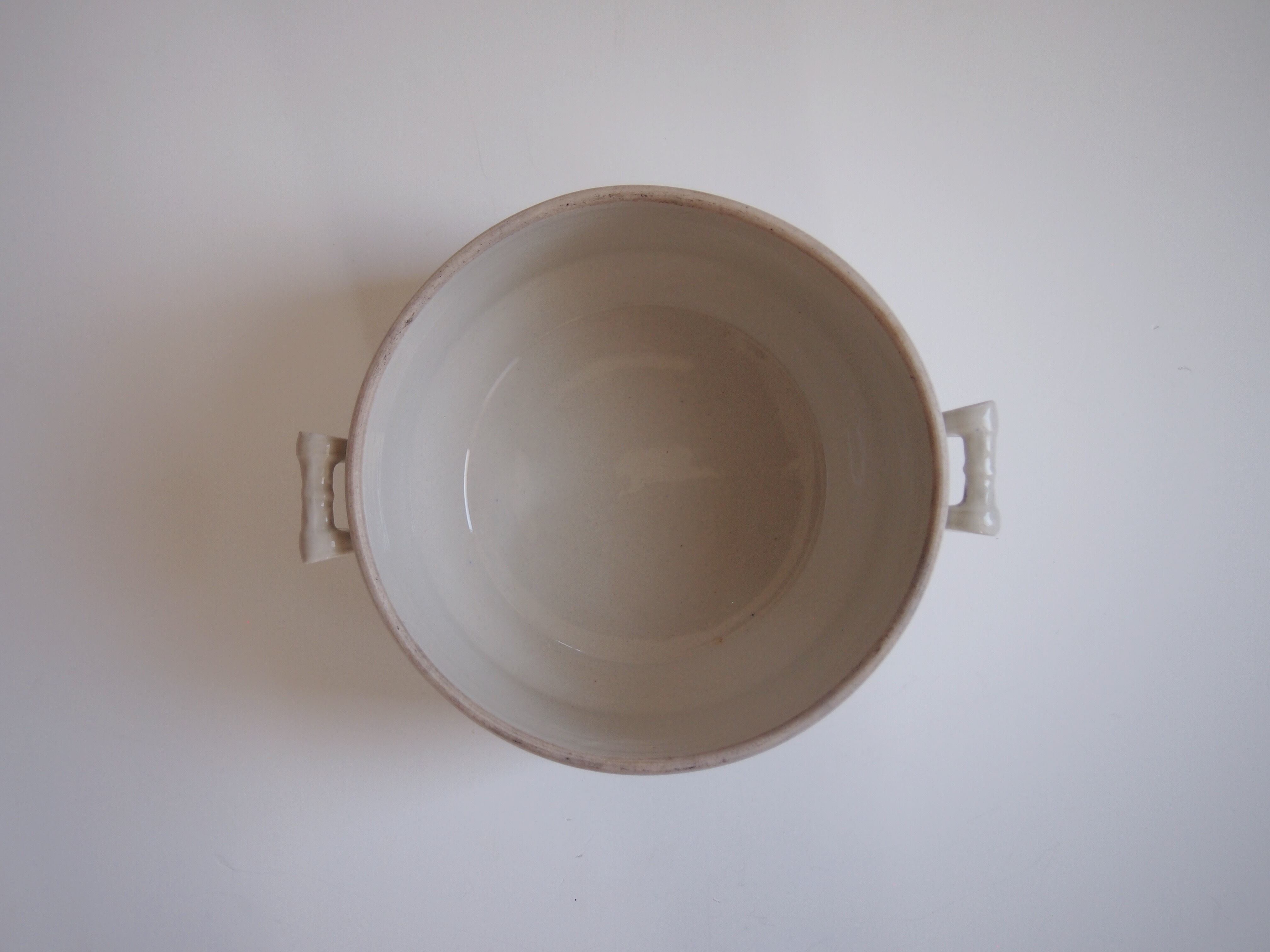 スーピエールとは、テーブルの上でスープをサーブするための器です。お湯を入れて暖めておいたスーピエールに出来立てのスープを鍋から移して、そのまま食卓へ。お客様にポトフやシチューなどを気軽におかわりしていただくためにテーブルに並べておくと、皆さん各々で蓋を開けてくださいます。