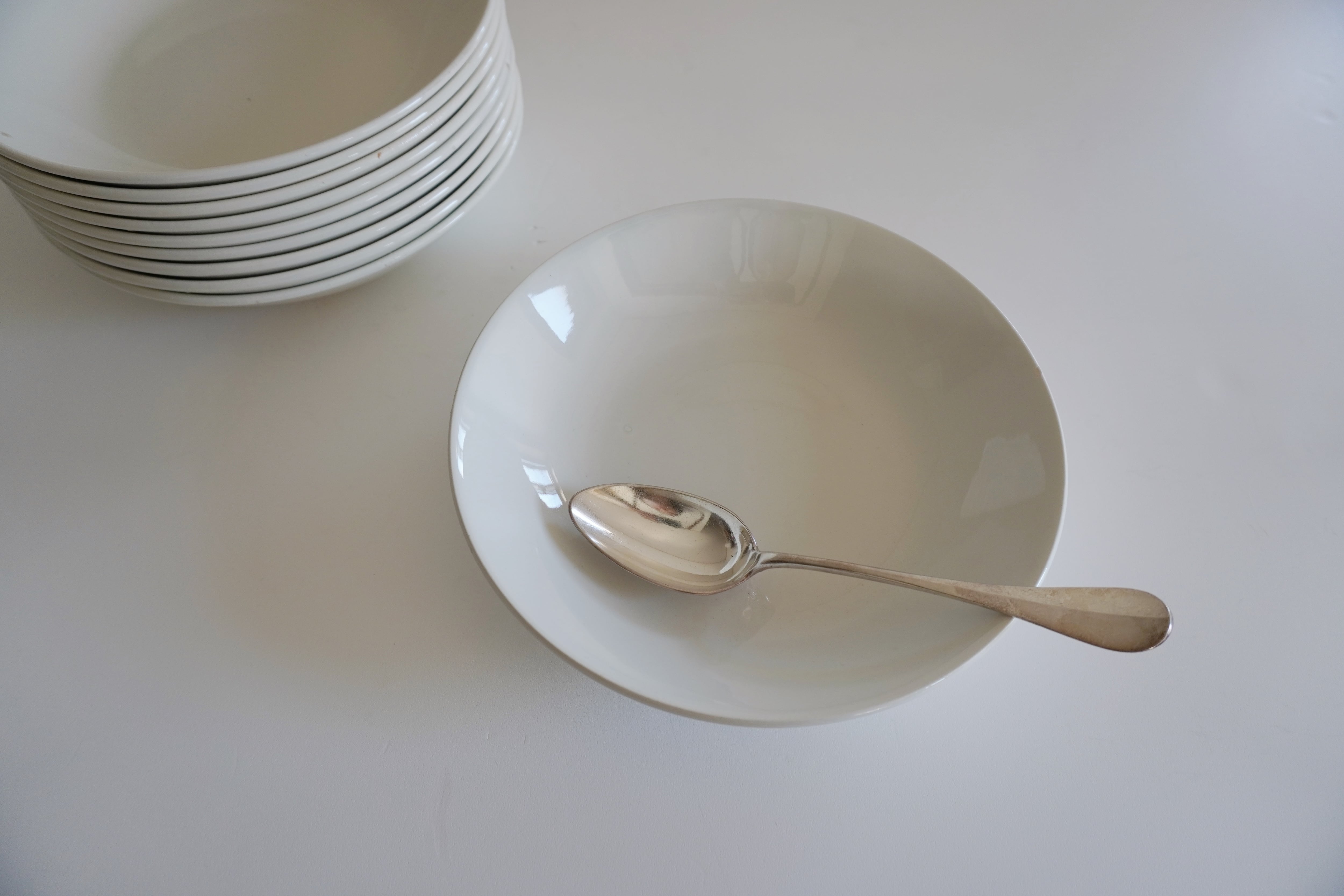 今回はデッドストックの状態で10枚見つかりました。リム付きの平皿やスープ皿と比べると圧倒的に数が少なく、レアと言うほどでもないけれどなかなか見つからない品ですので、まとまった数をお探しの方には絶好の機会です。