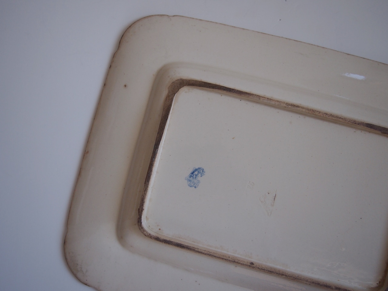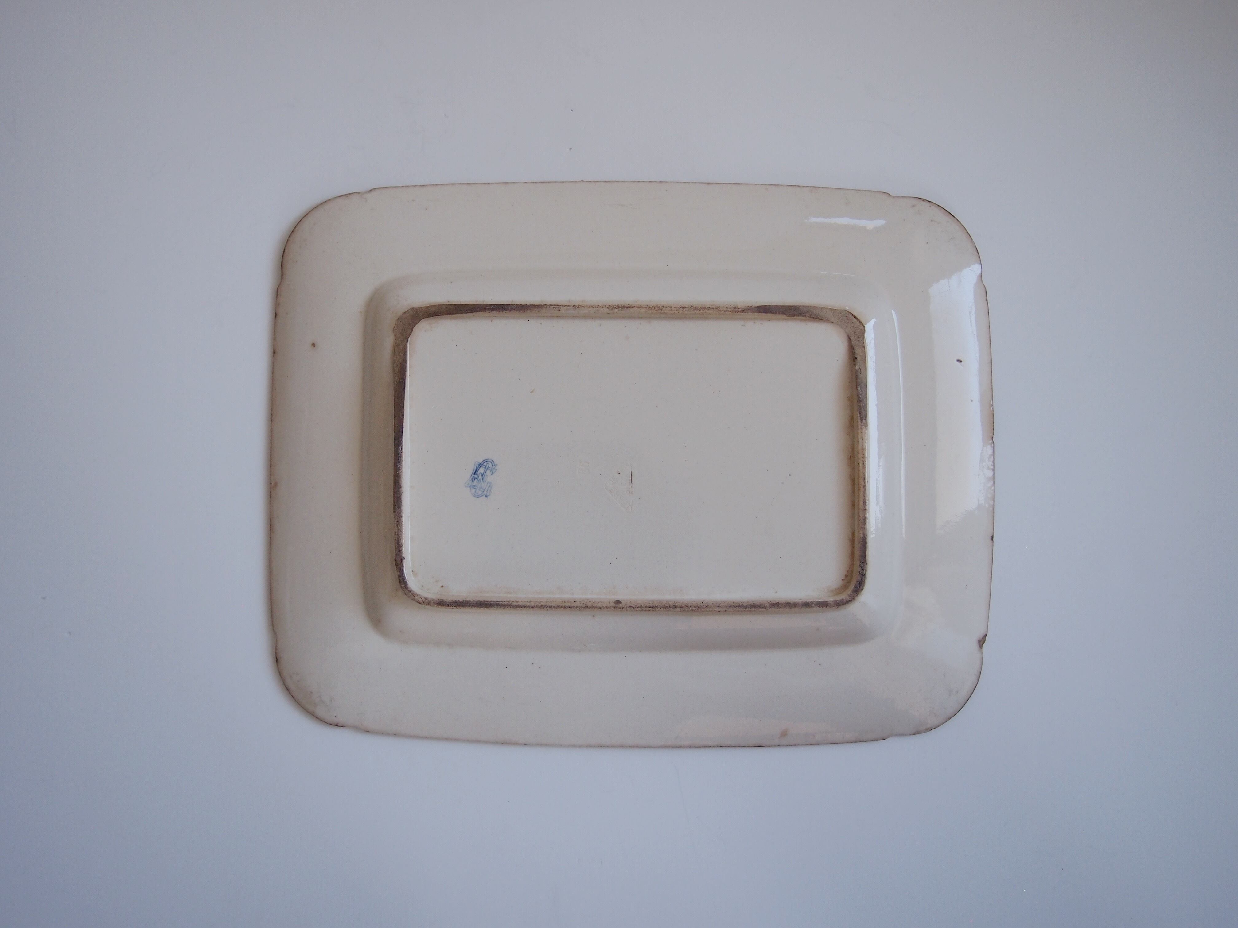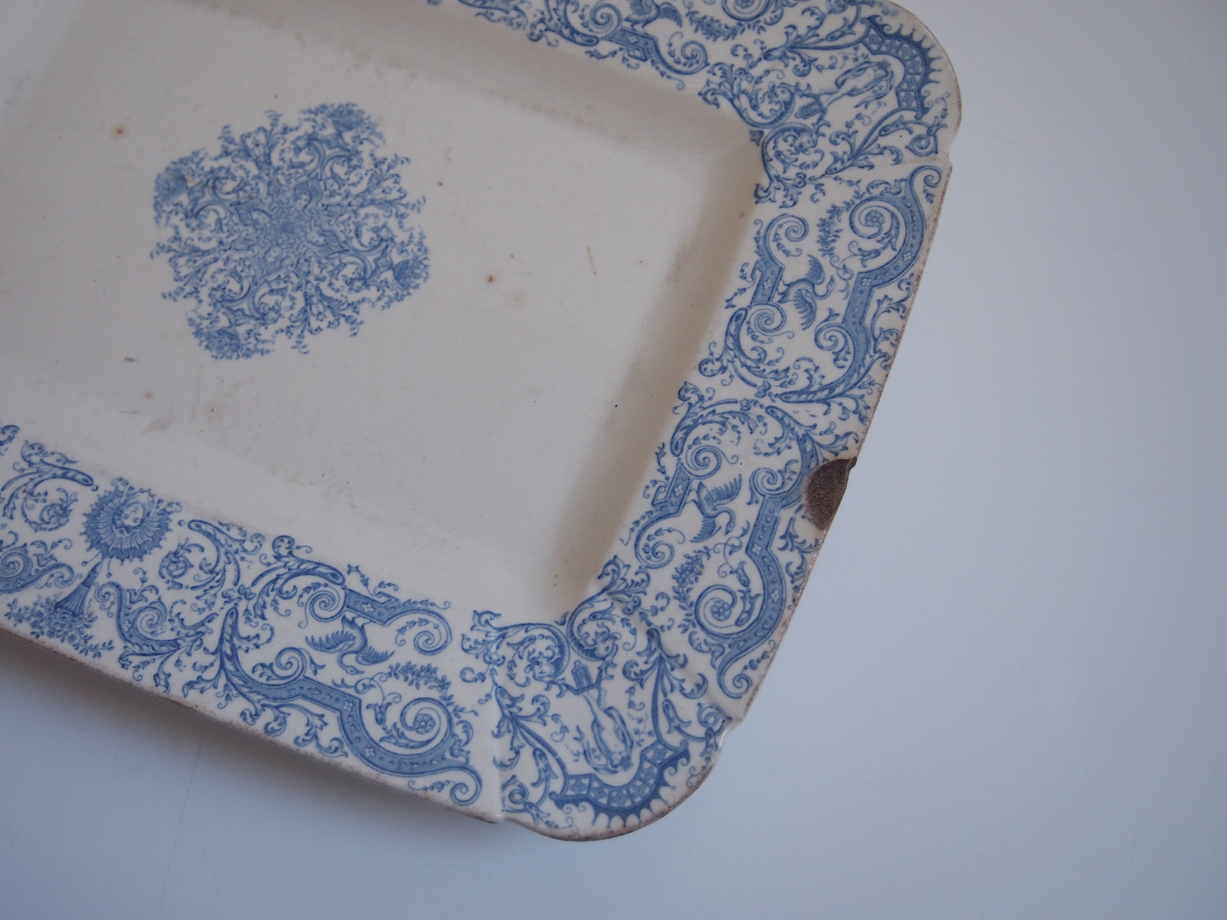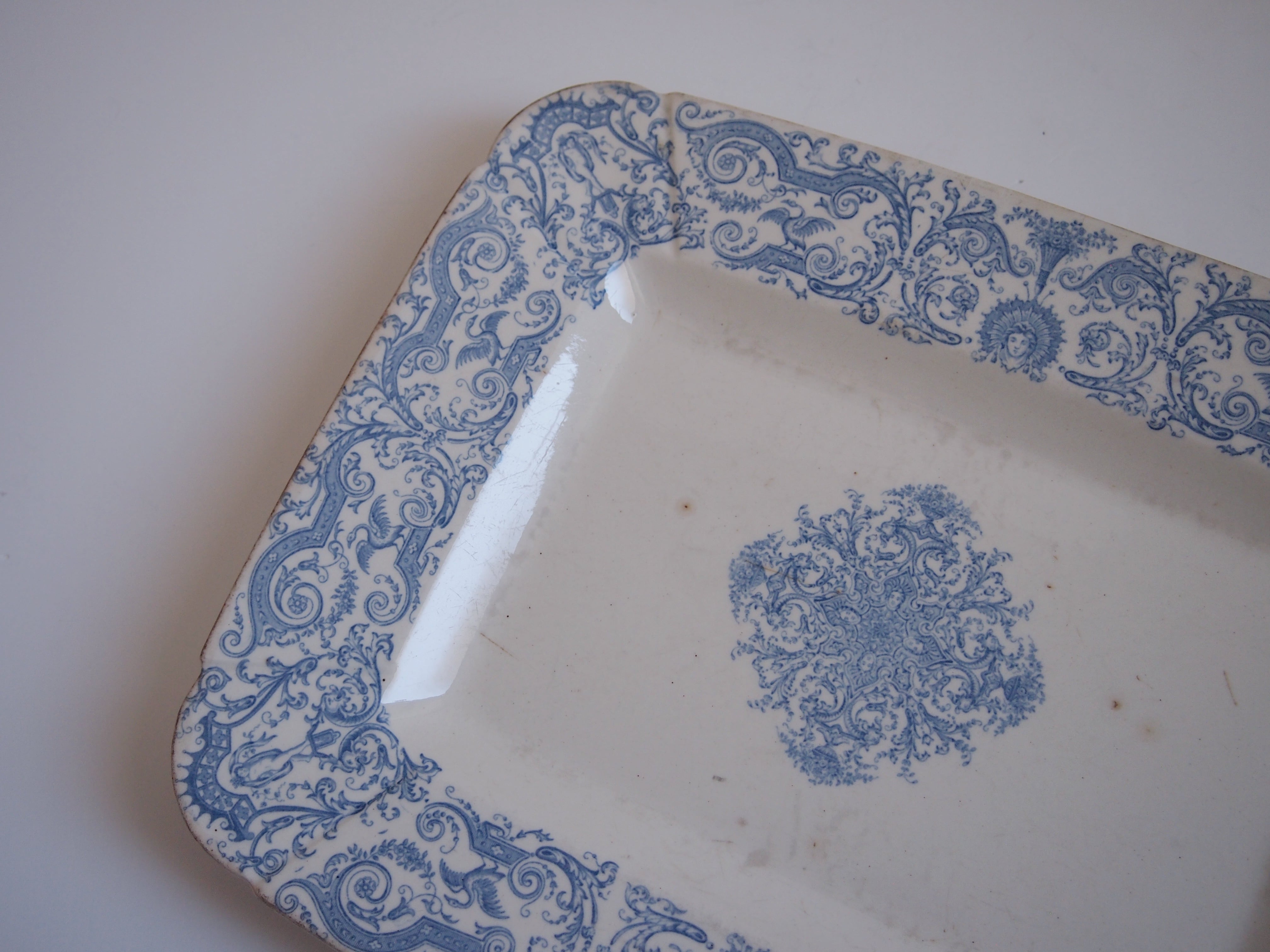 1800年代フランス Gien(ジアン)のレクタングルプレート。エクリュの肌に淡いブルーのアールヌーボー模様が美しい大皿です。