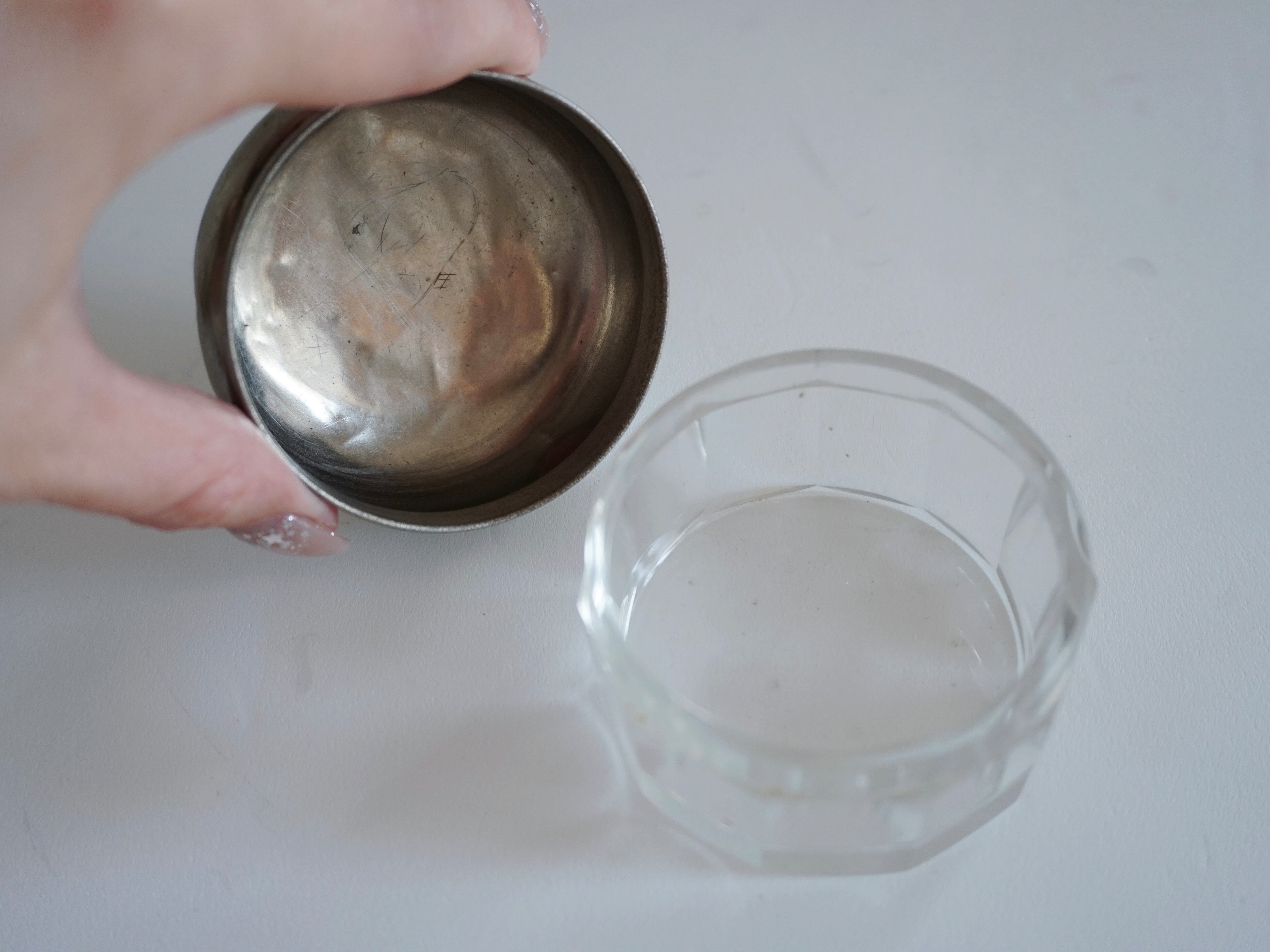蓋はシルバーのコーティングが剥がれて素地が見えています。へこみもみられますが、開閉はスムーズでぴったりとはまります。機能性十分で実用的なアイテムです。