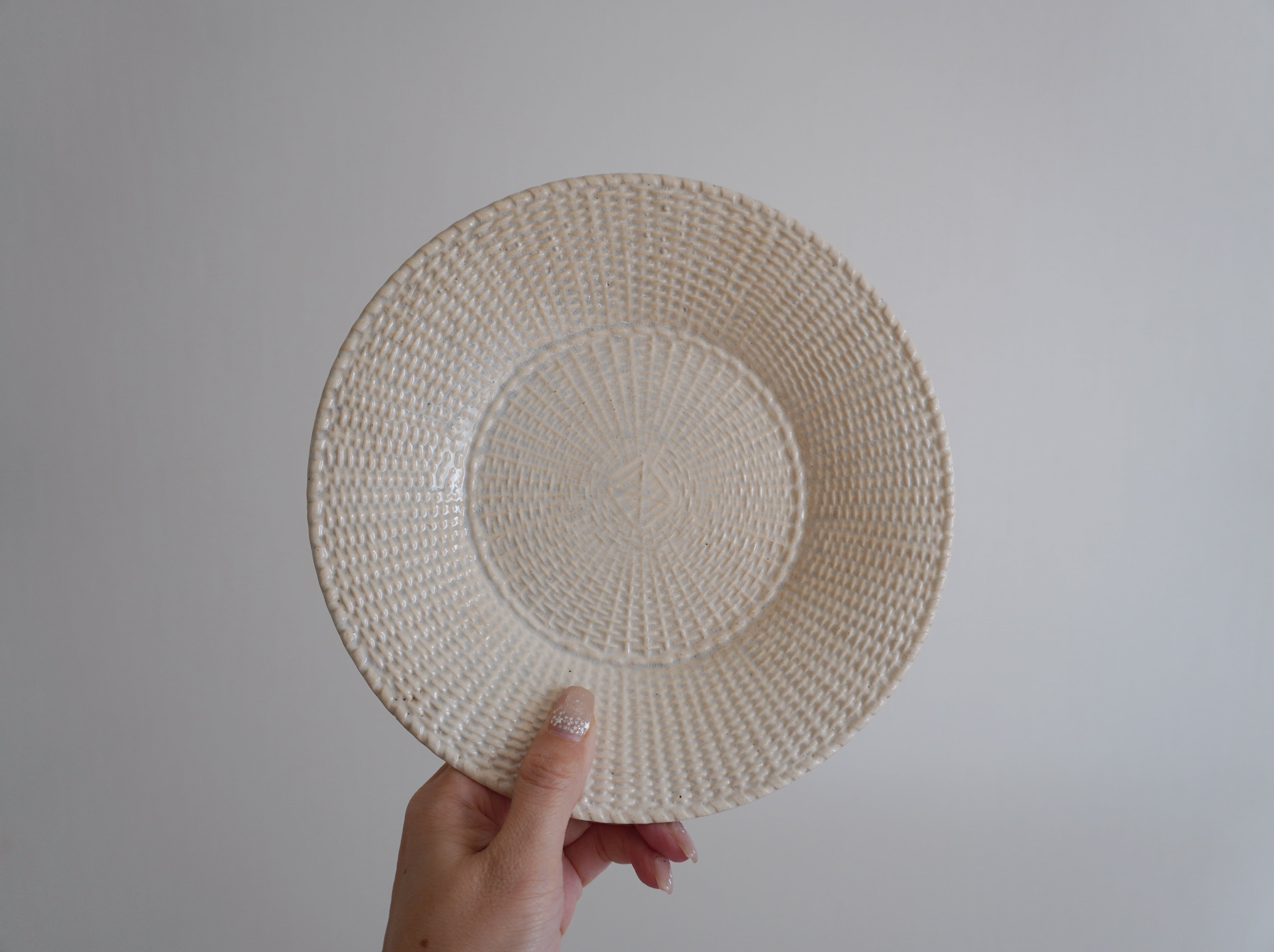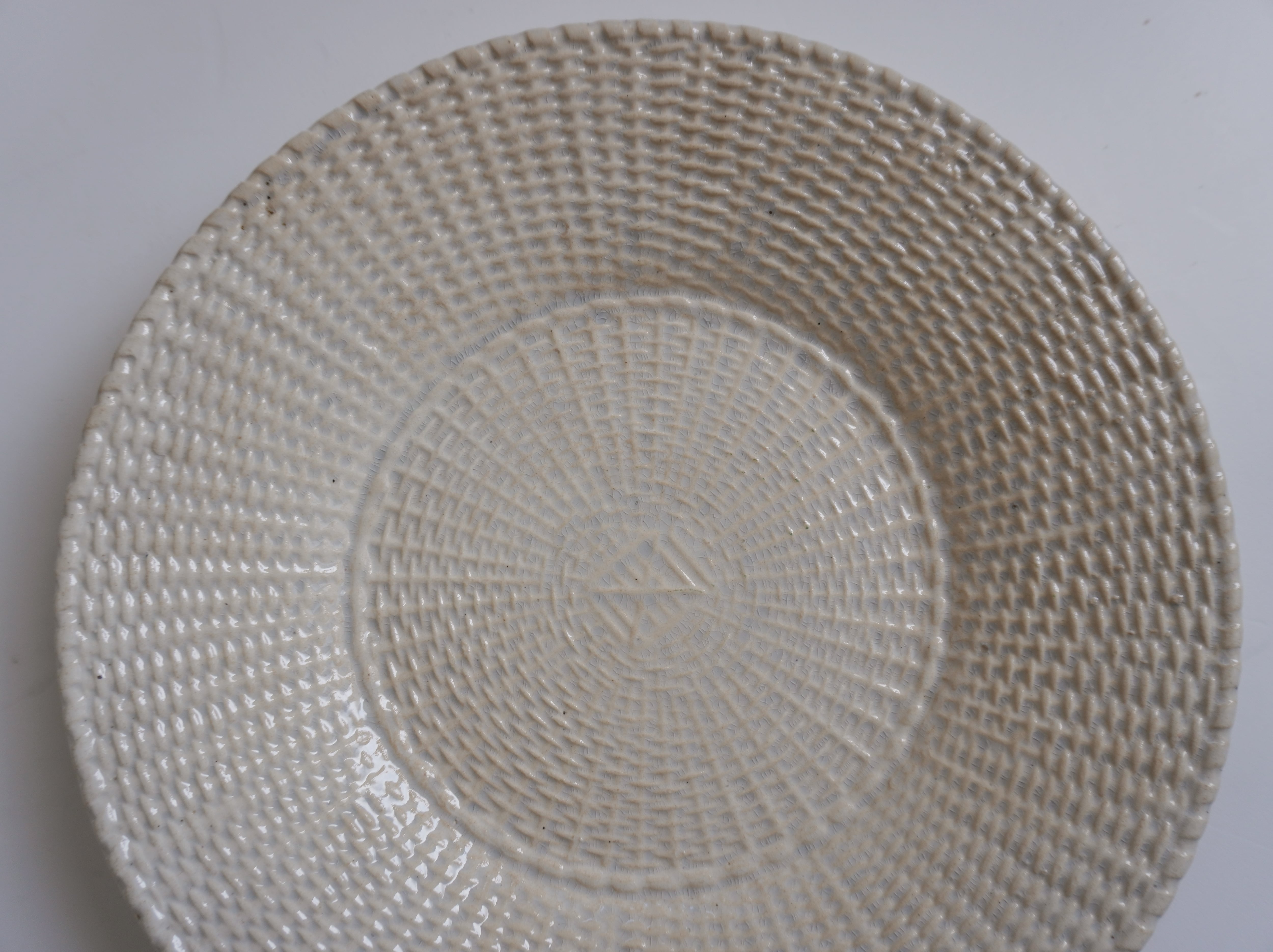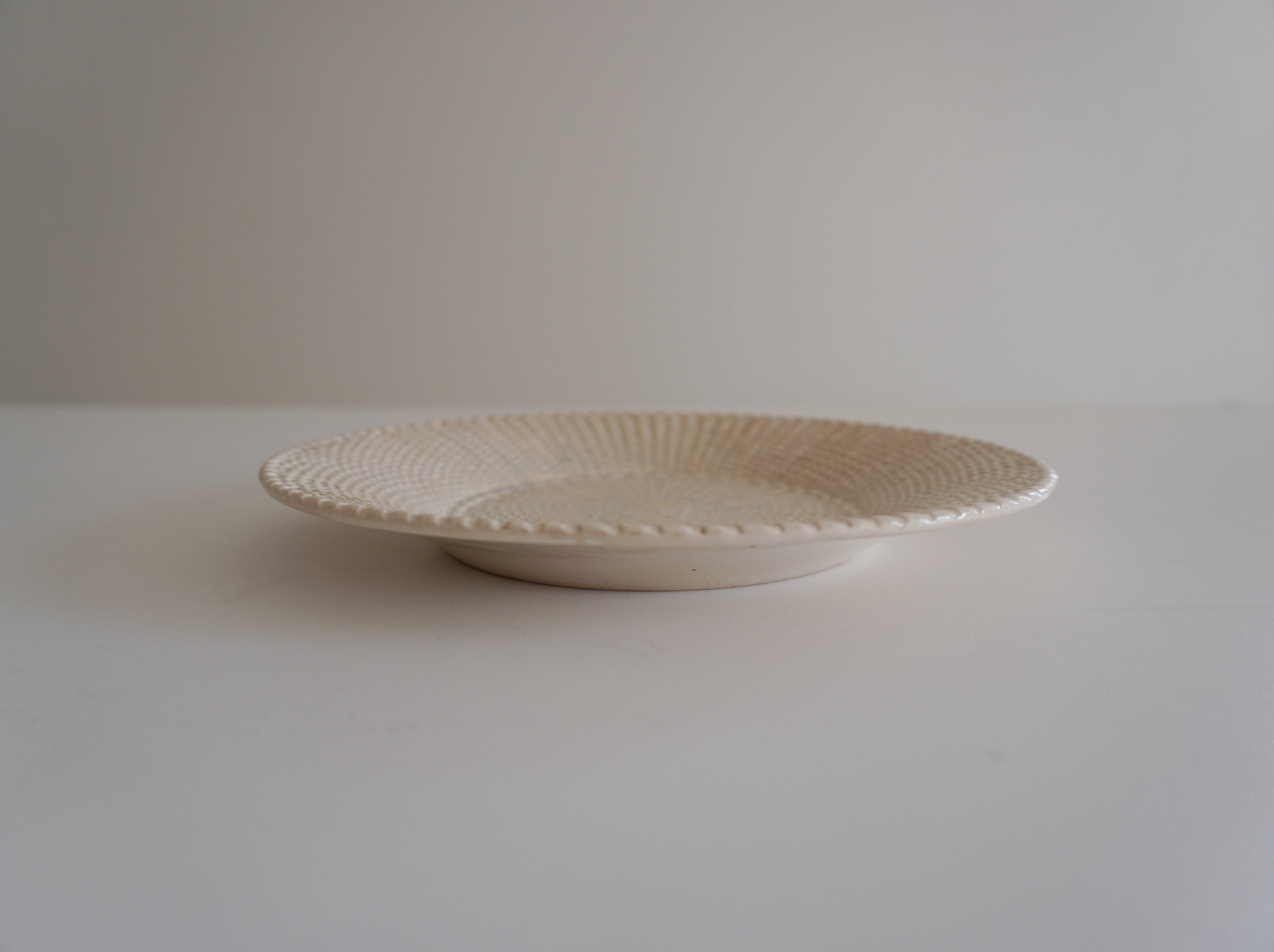 エンボスのパニエ模様が美しいテールドフェールのプレート。パン皿として作られたものだと聞きました。バックスタンプはありますが滲んでいて識別できません。