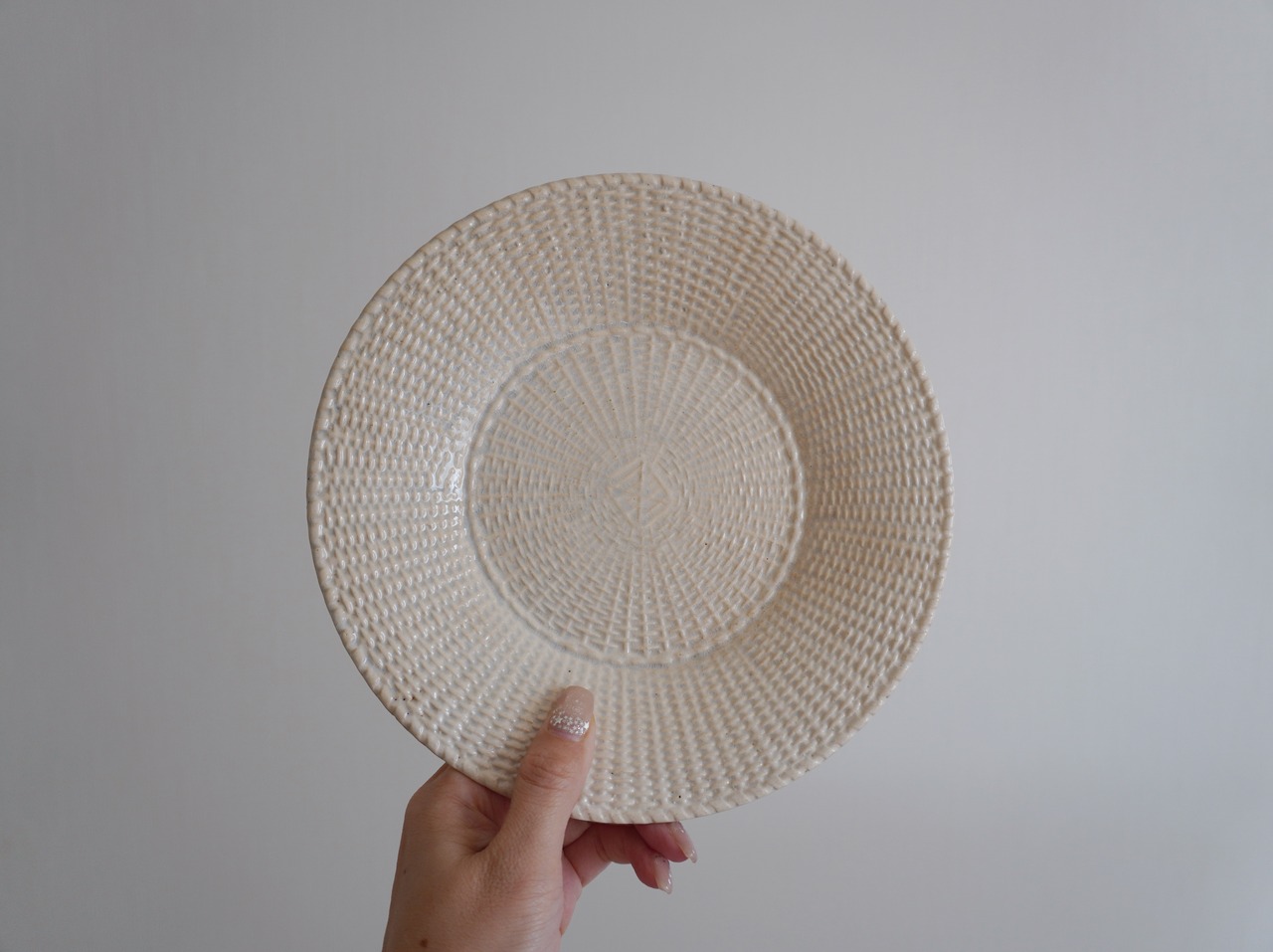 細かな貫入やベージュの染まりがこのパニエ模様の魅力を一層引き立ててくれています。裏側に見られるラインは表側には届いておらず、水漏れもありません。