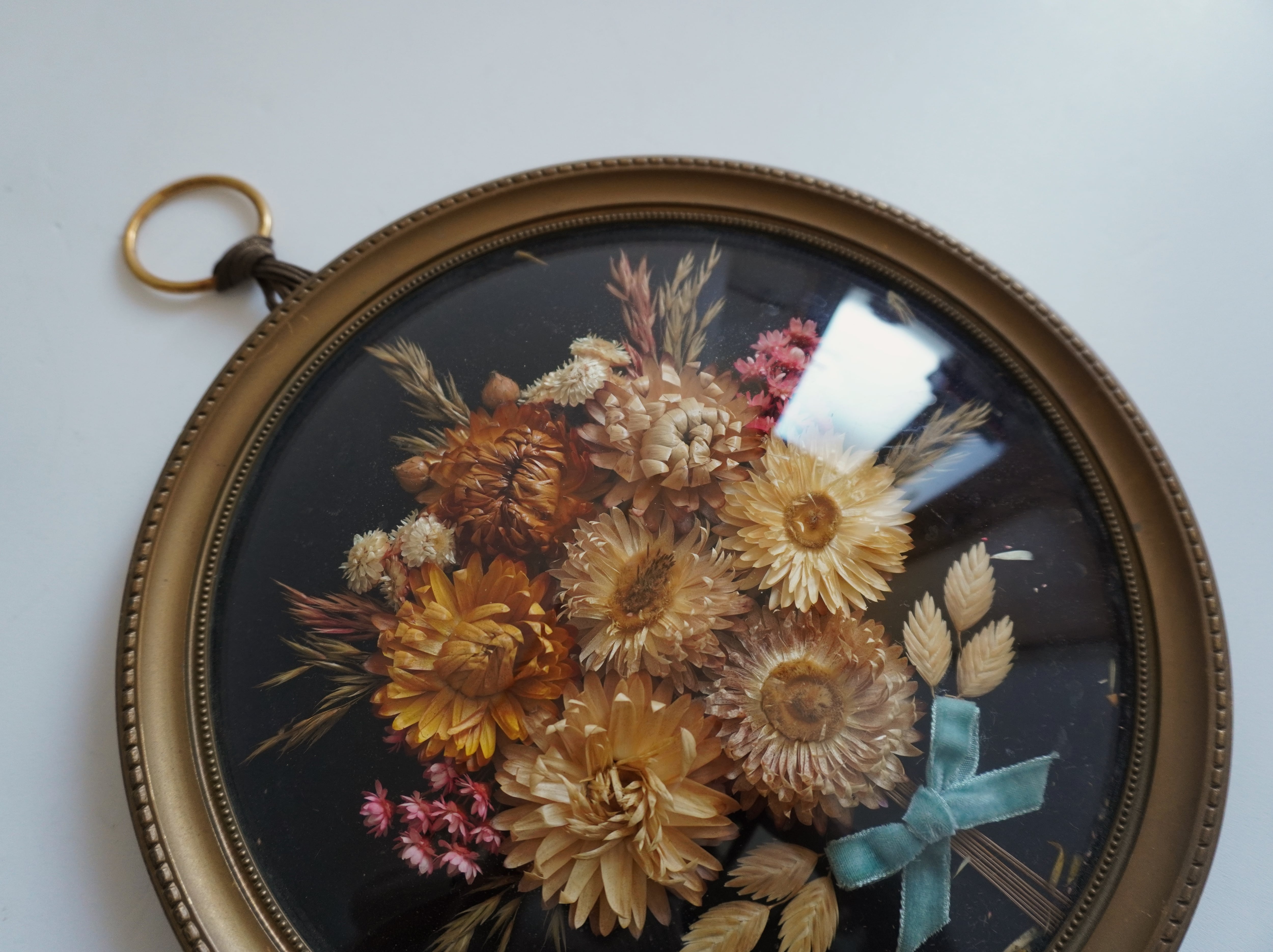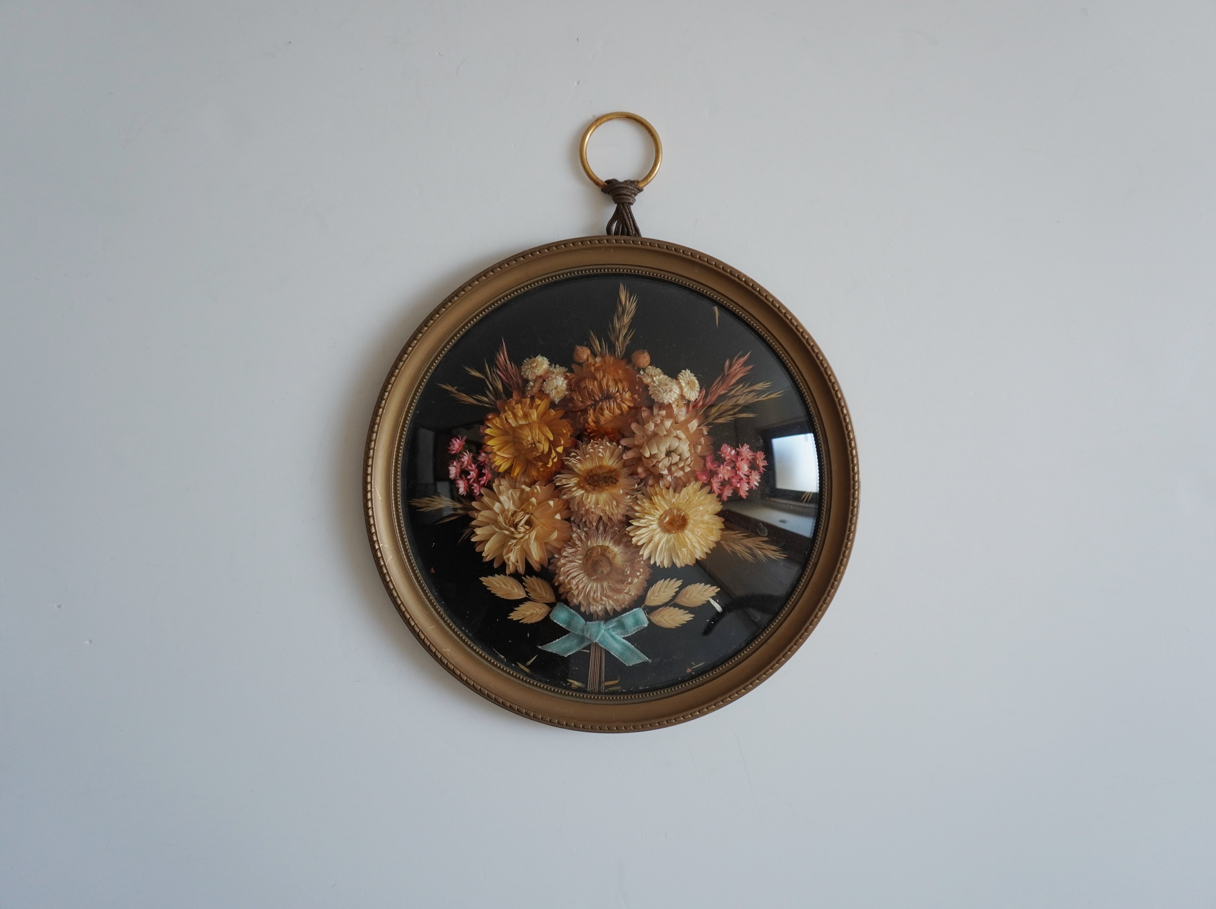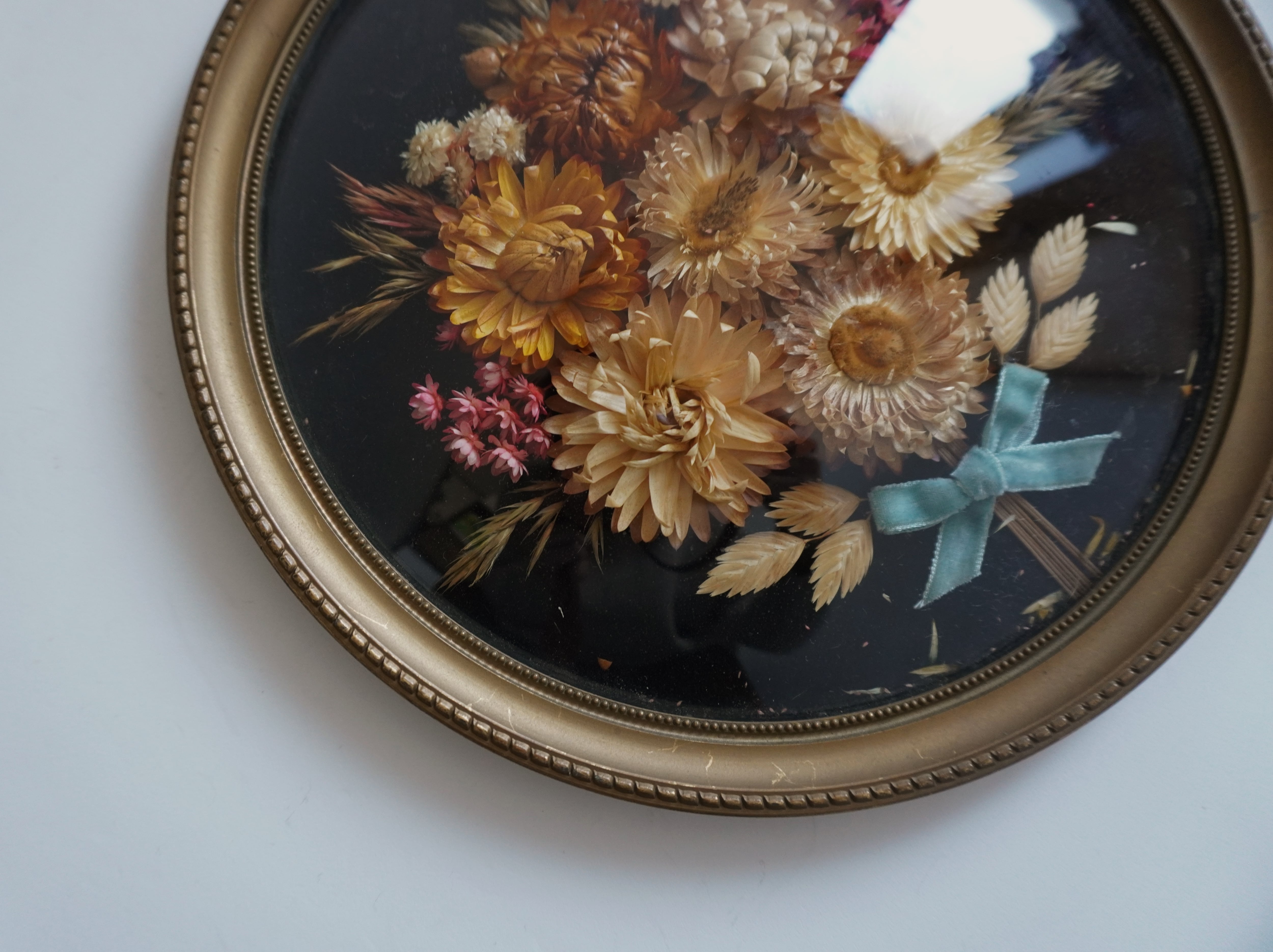 メダイヨンと呼ばれるガラスドームに美しく額装されたドライフラワーの壁飾り。
