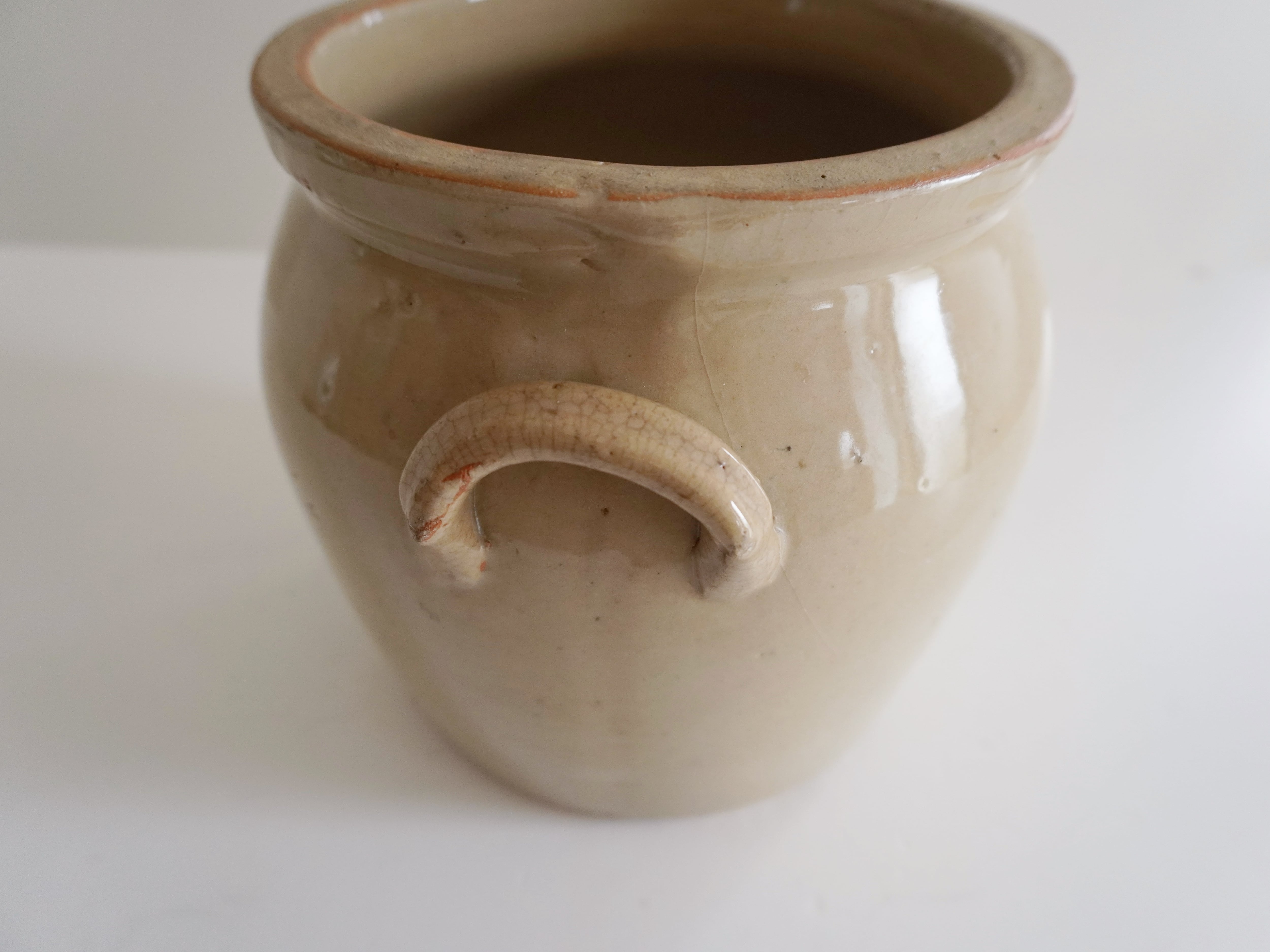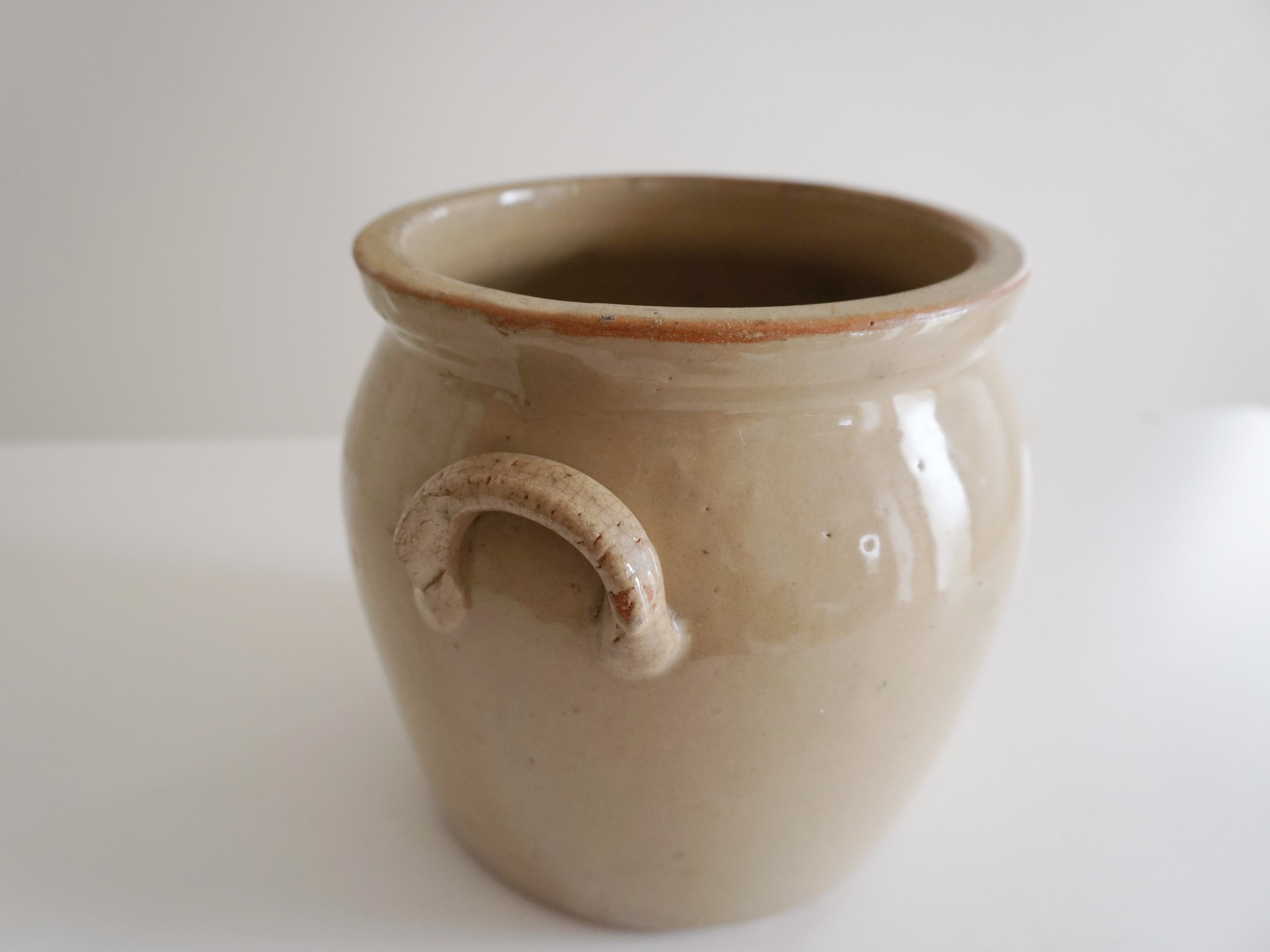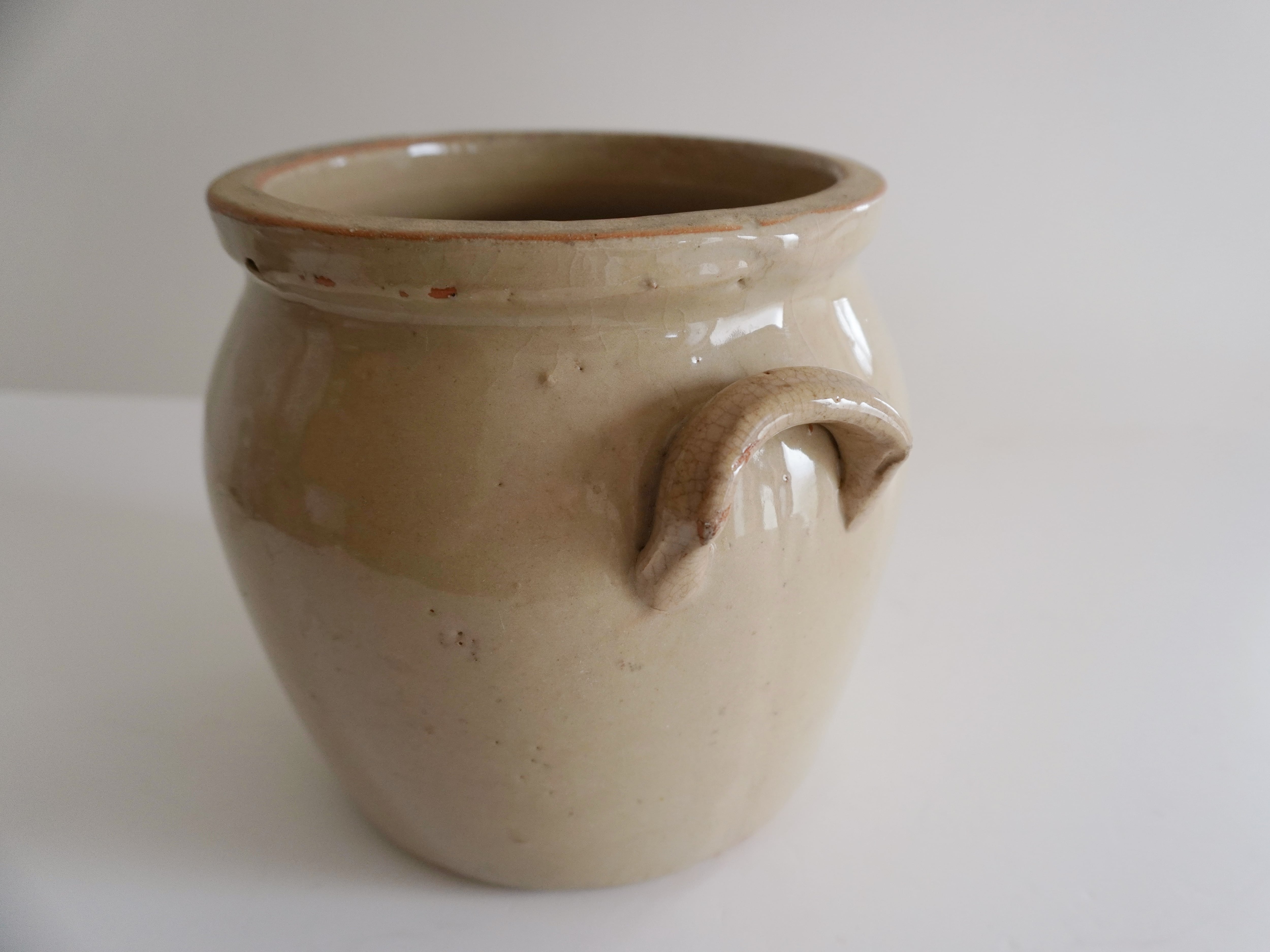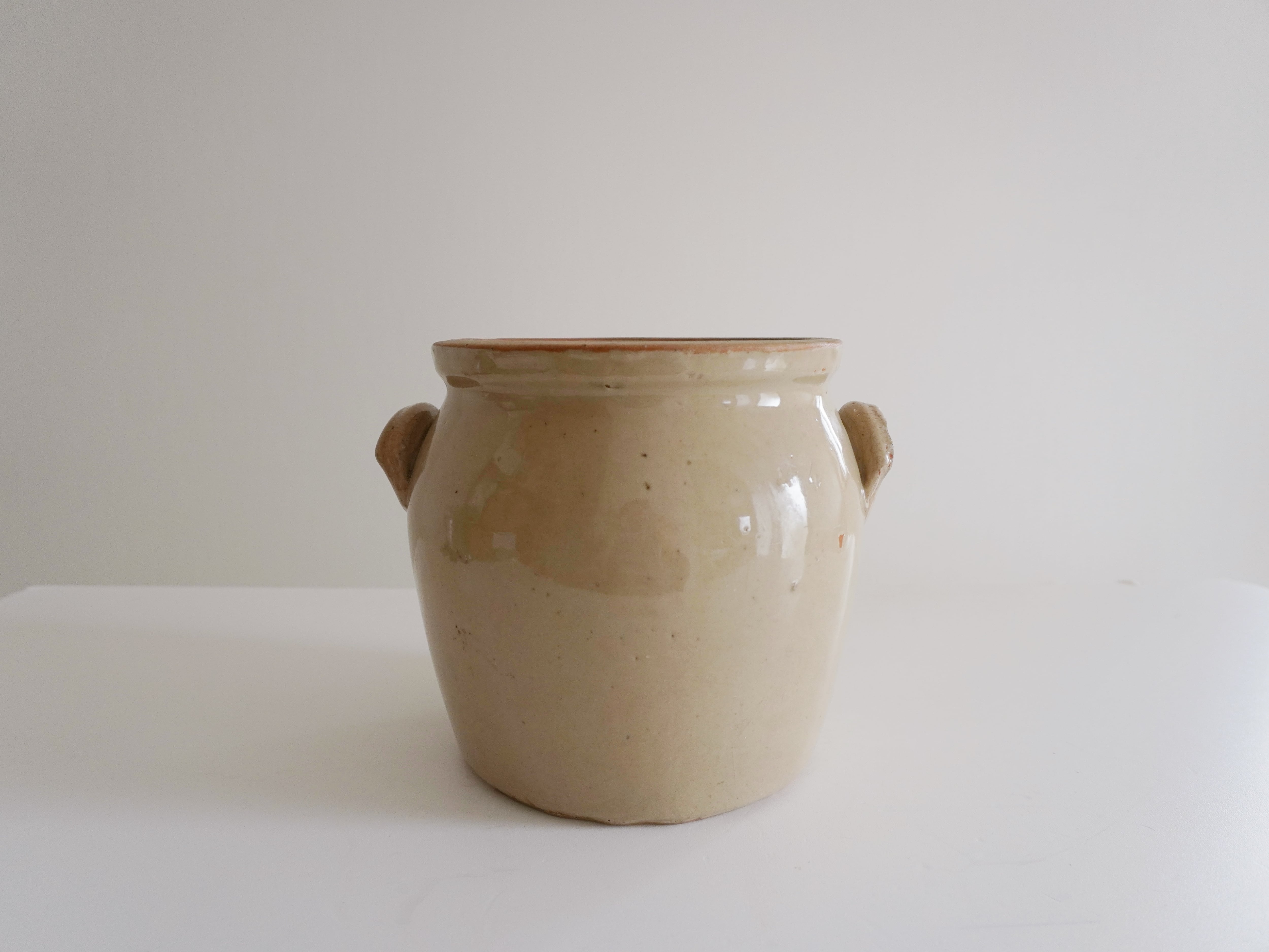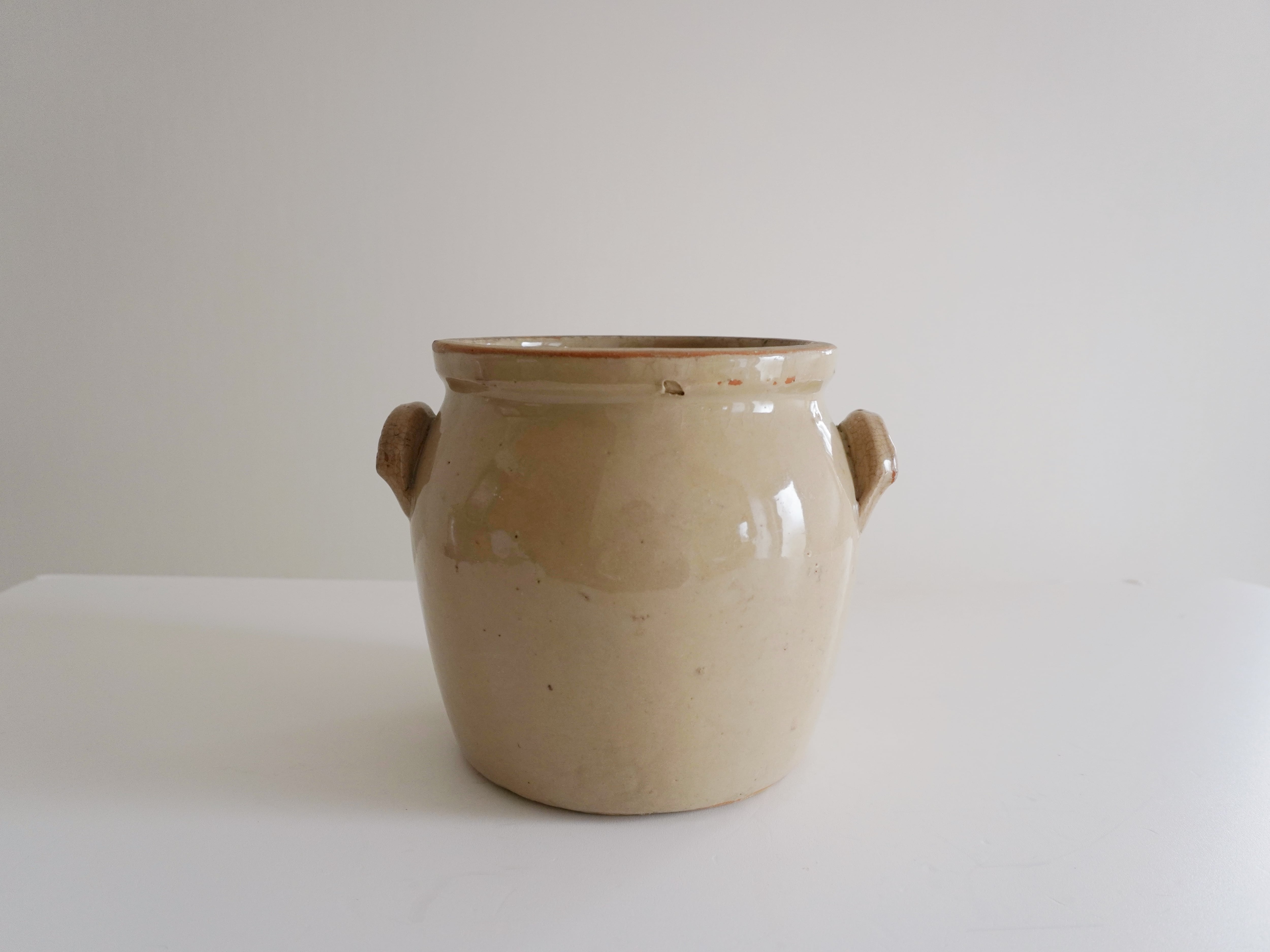 フランスの大きなコンフィポット。艶のあるぽってりとしたベージュが優しい雰囲気。