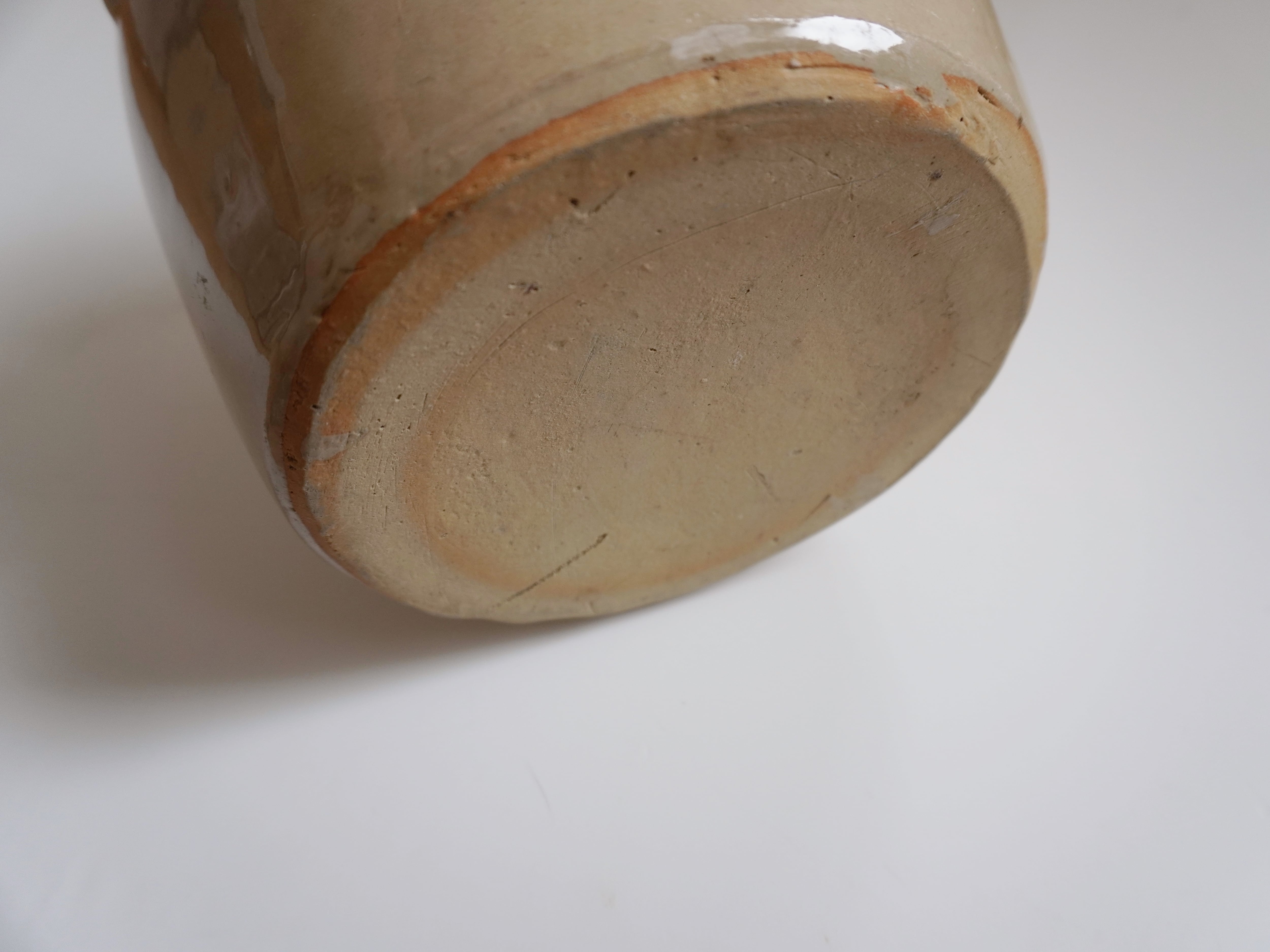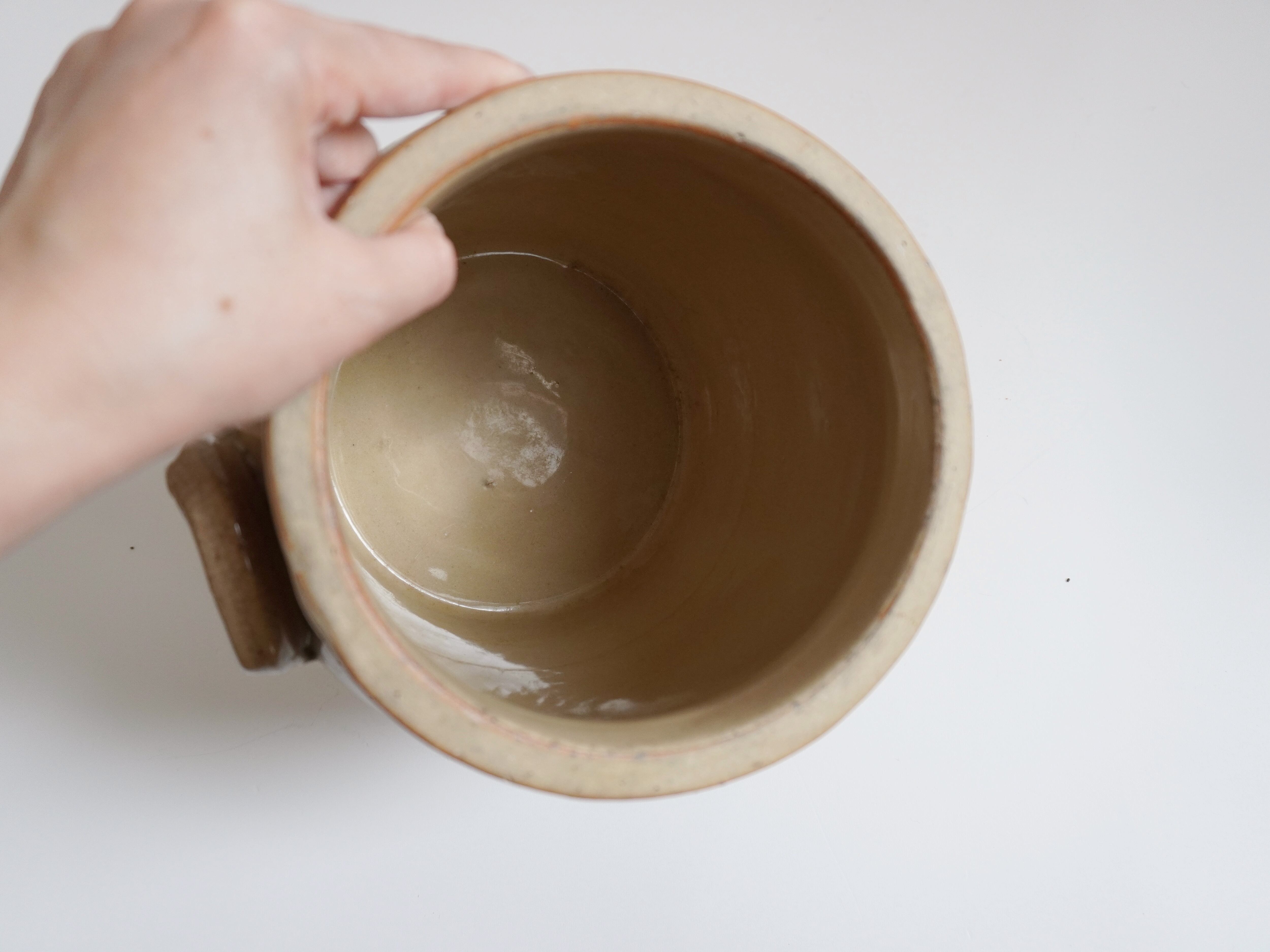 画像3枚目でご確認いただけますが、片方の取っ手に欠けがございます。陰になる部分で目立ちにくいです。画像5枚目ではヘアラインも確認できます。48時間水を入れた状態で様子を見たところ、水漏れはありませんでした。その他、焼成時にできた釉剥げやピンホールなどございます。古い時代の手仕事による陶器の味わいとしてお楽しみください。
