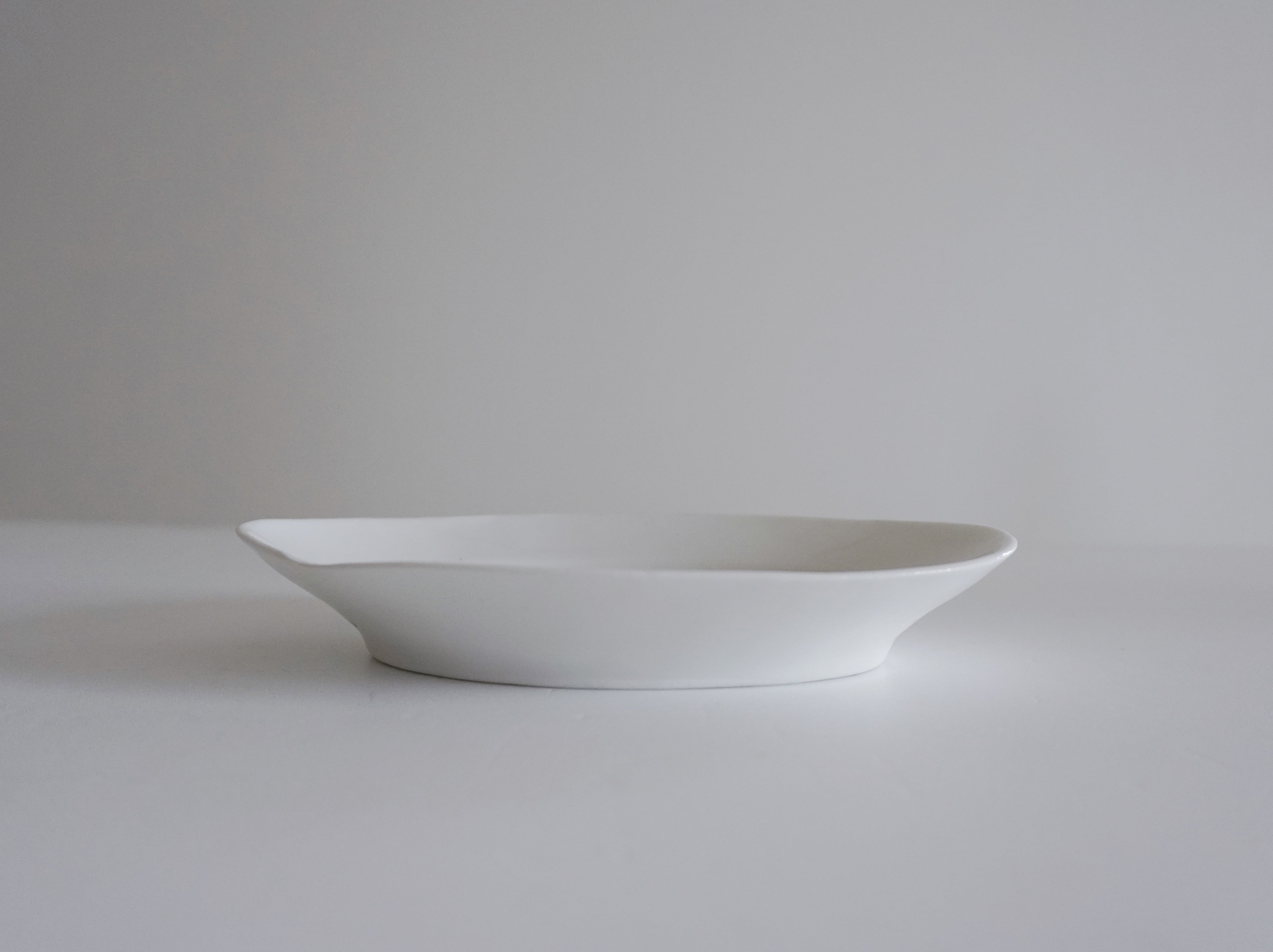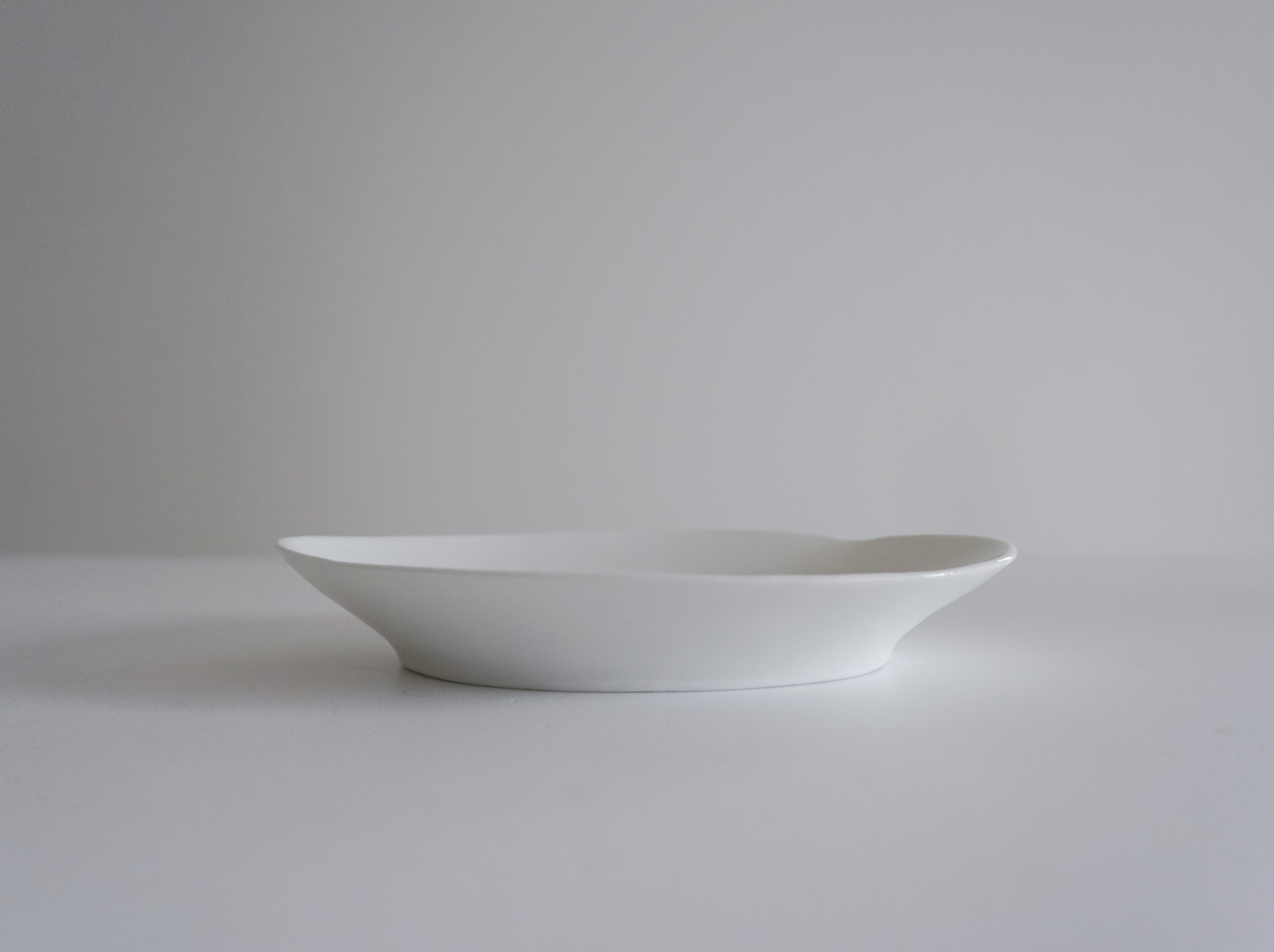 とろりとした白くなめらかな質感がとても美しく、リムの立ち上がりもすっきりと綺麗です。シンプルなつくりながらも存在感があり、何を盛っても様になる一枚。