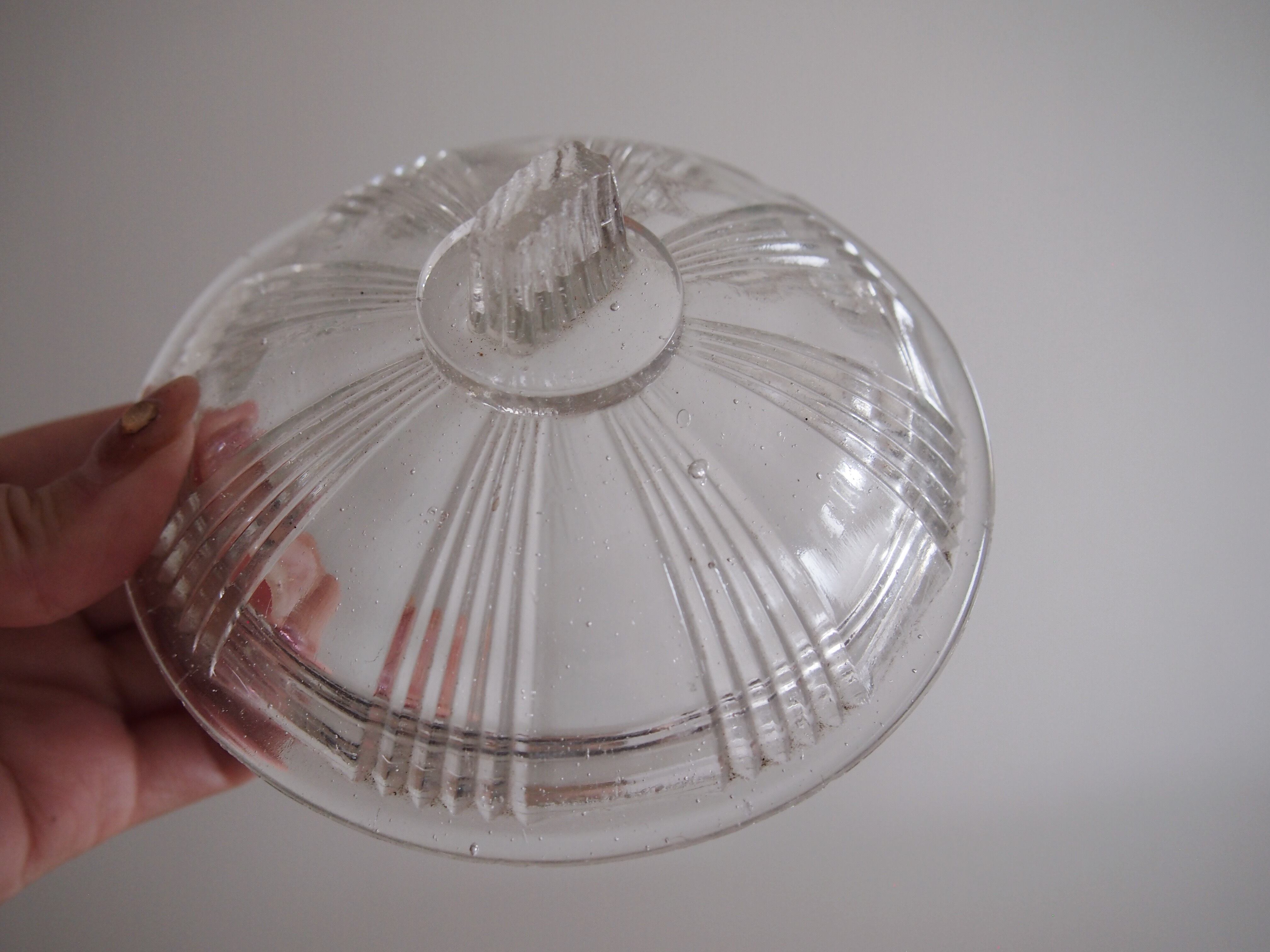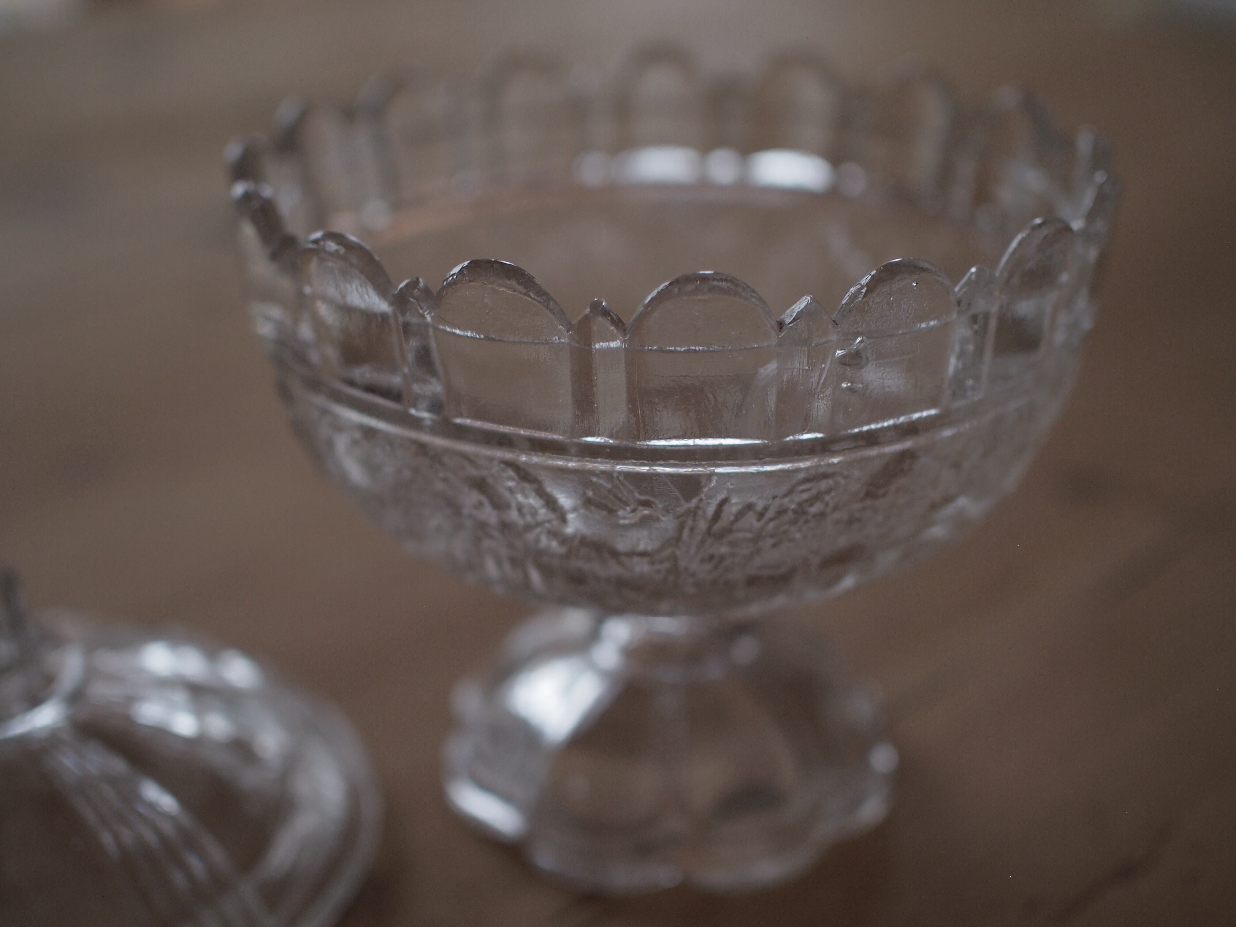 プレスガラスという技法で作られており、気泡がたくさん閉じ込められています。光のあたりやすい棚の上や窓辺に飾るとキラキラして綺麗です。
