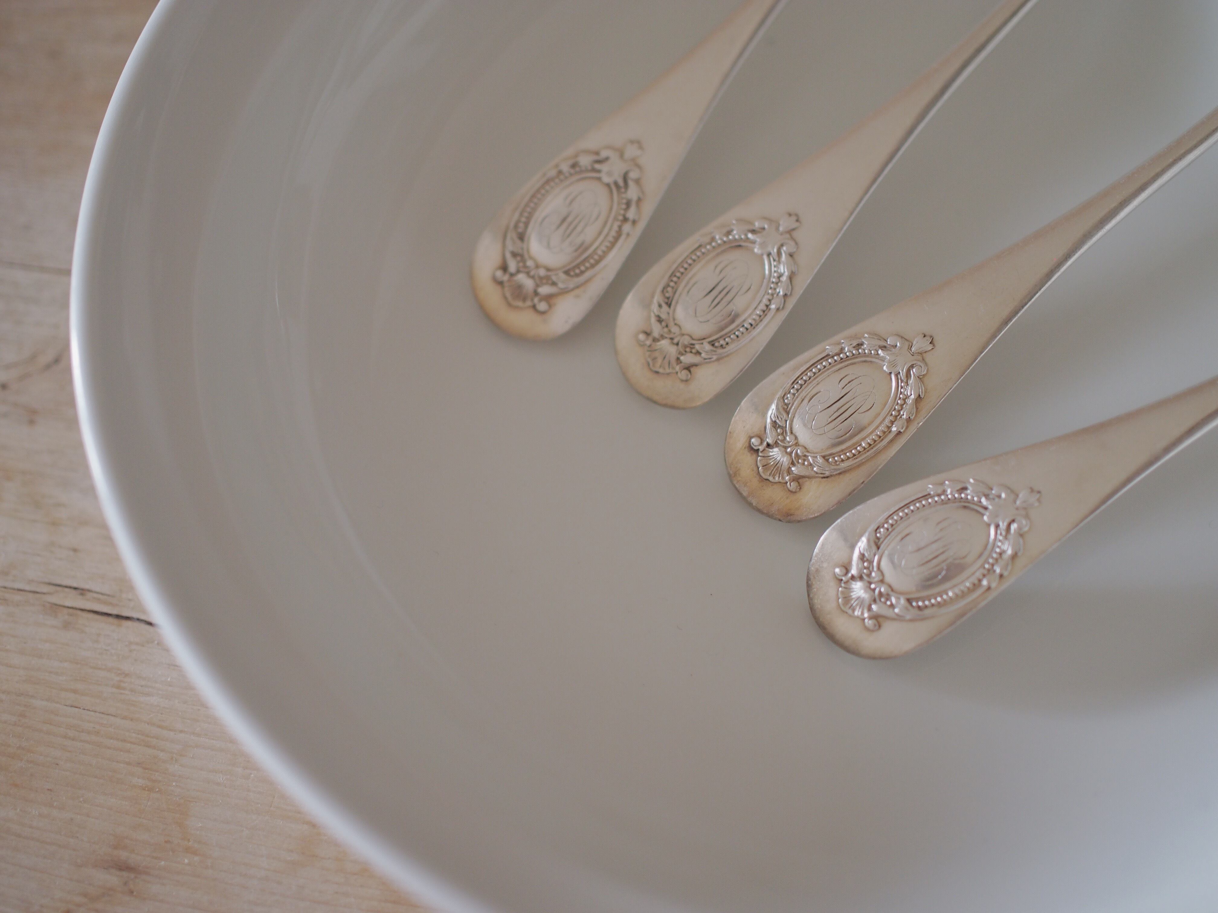 当時富裕層や貴族などしか買うことができなかった銀食器に、自分の名前や家紋などを彫金師に彫り込ませることが流行しました。こちらは裏側に美しい装飾の中央にモノグラムが刻まれています。