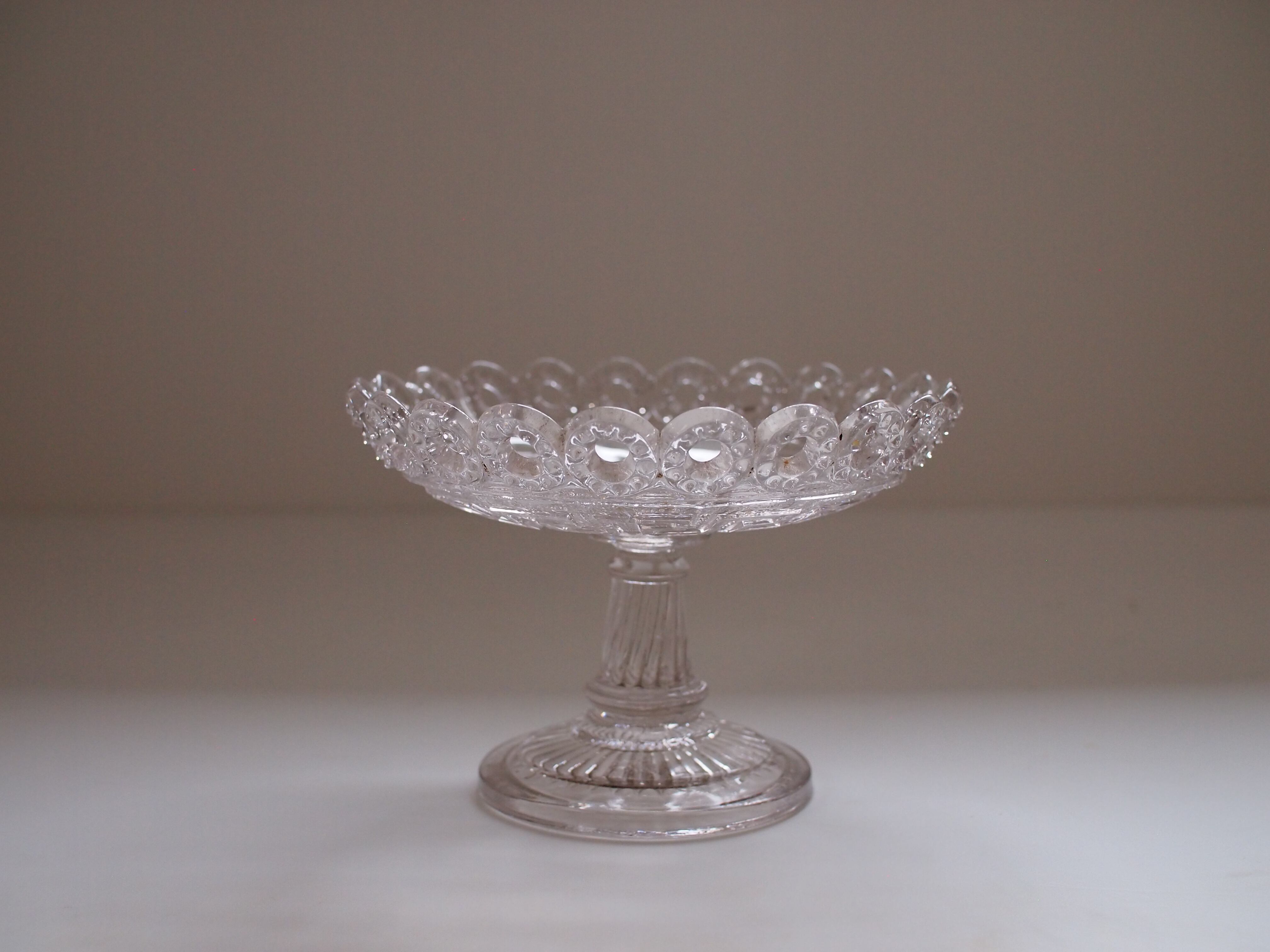 南フランスの蚤の市で見つけたガラスコンポティエ。エッジは透かしになっています。脚の部分の装飾も美しいですね。