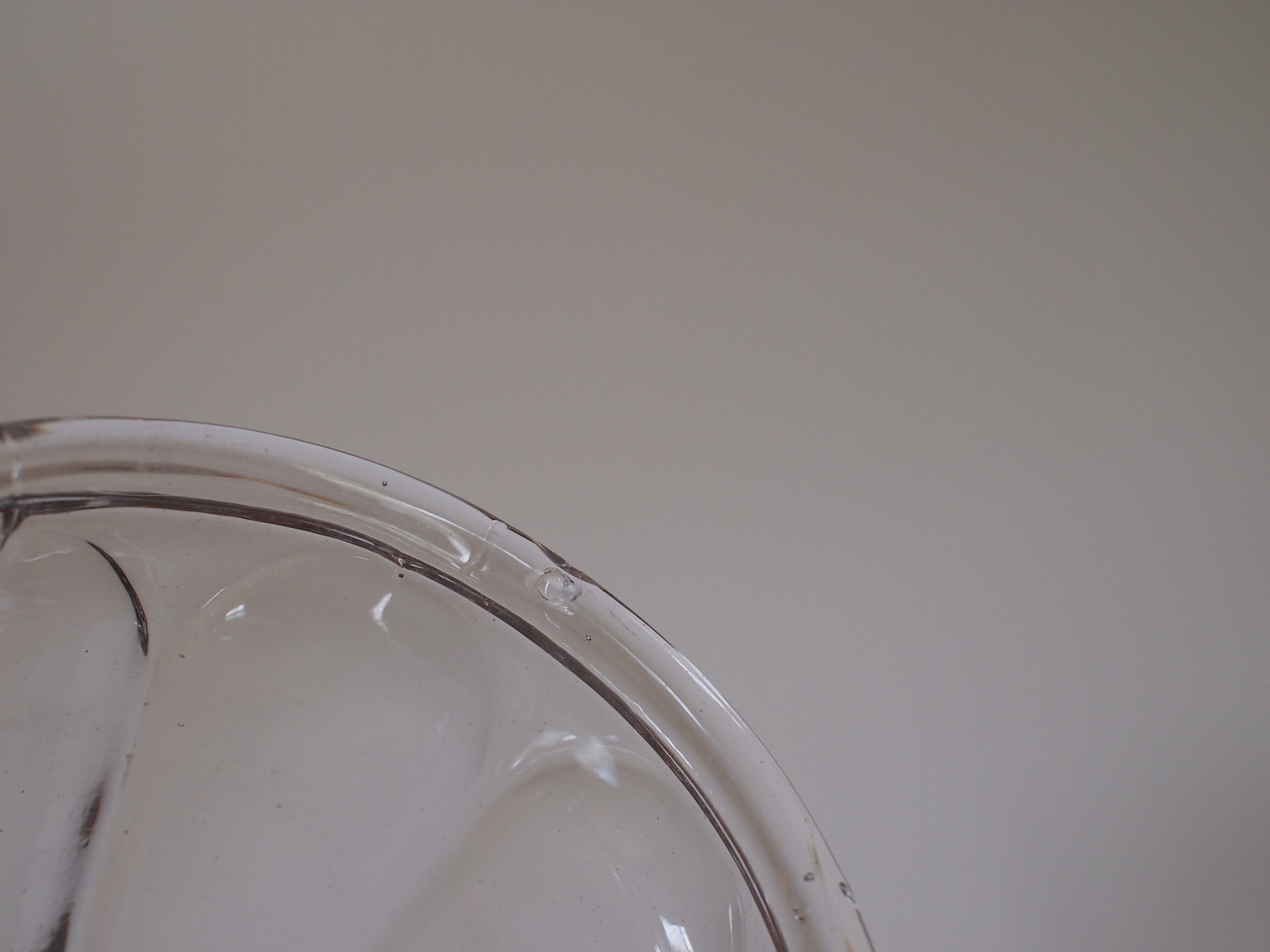 ぽってり厚みのある丈夫なガラスで、ゆらゆらとしたとろみがあったり、ぷつぷつとかわいい気泡が閉じ込められていたり、ひとつひとつ違う表情をお楽しみください。年代物のガラス故に、製造時からの凹凸や底部分のガラスの剥がれ、小さな欠け、汚れ、ガラスのシワ等ございます。こちらはエッジ部分に、触っても手を傷つけることのない程度の欠けがございます。