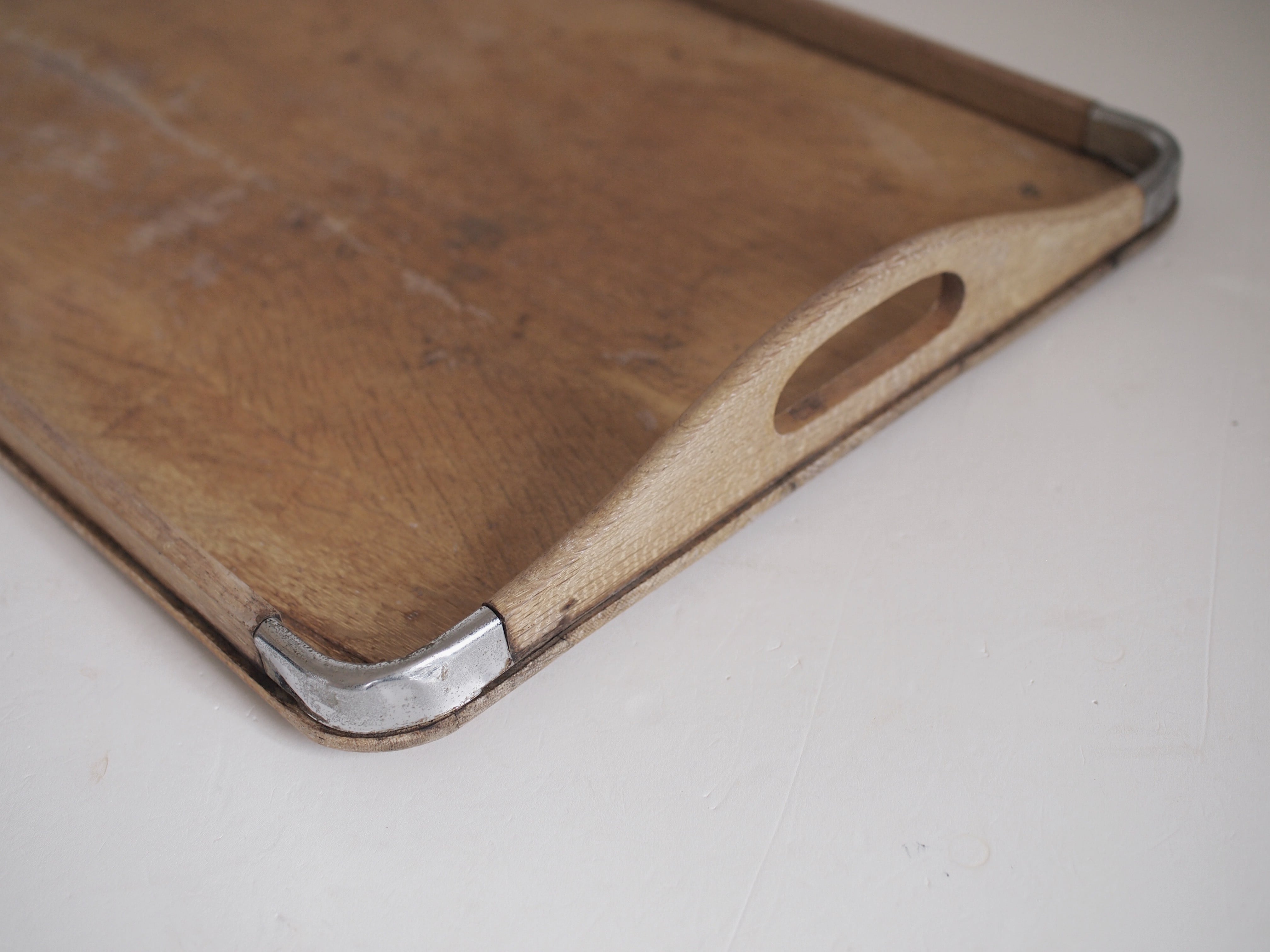 古い角形の木製トレー。四隅は銀色の金属で補強されています。