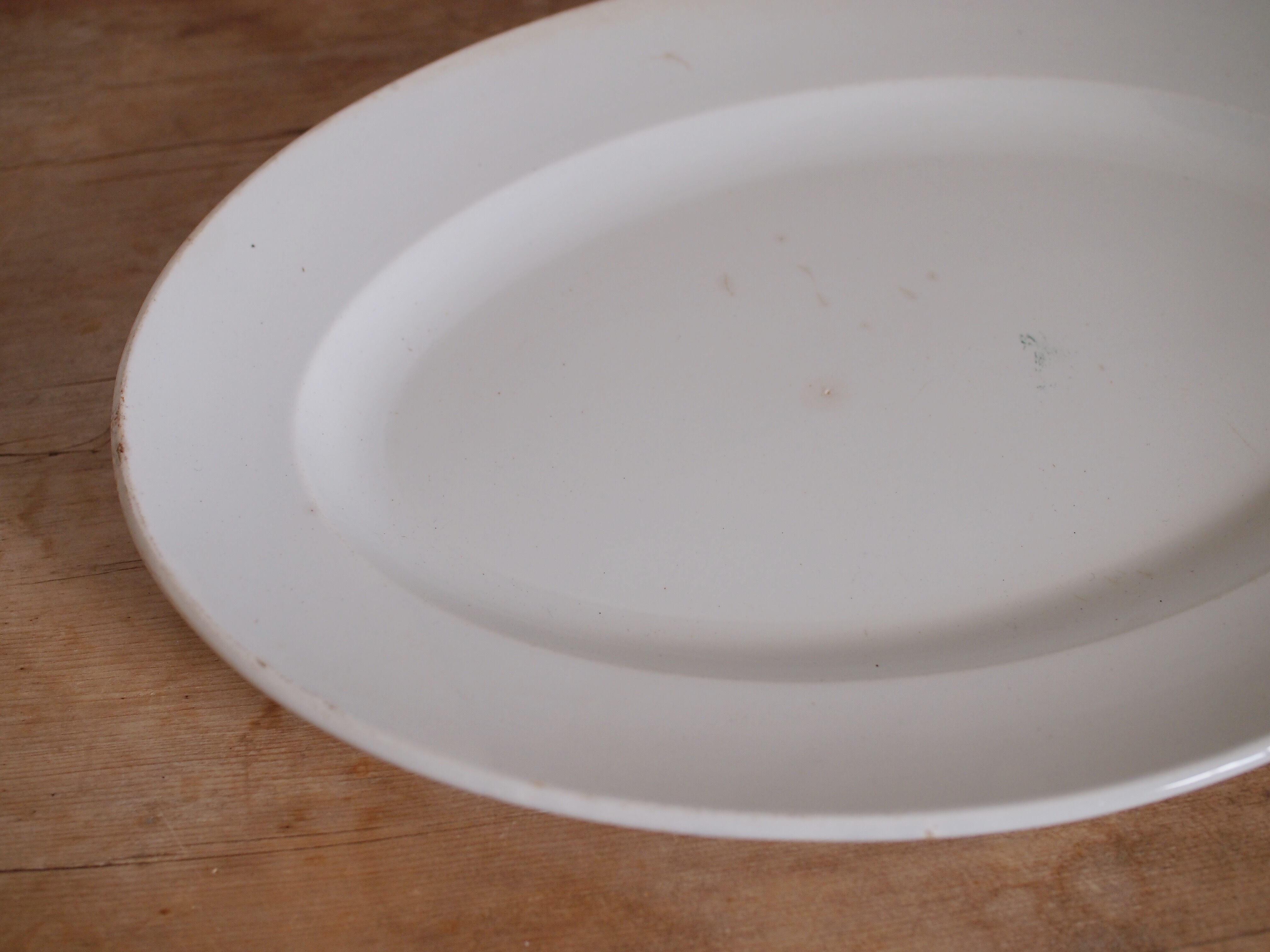 Creil et Montereau(クレイユ エ モントロー)のオーバルプレート。明るめのécru(オフホワイト)が美しくやわらかな印象。細かな傷汚れも良い味となっており、シンプルな無地でもアンティークらしい温かみのある雰囲気に。