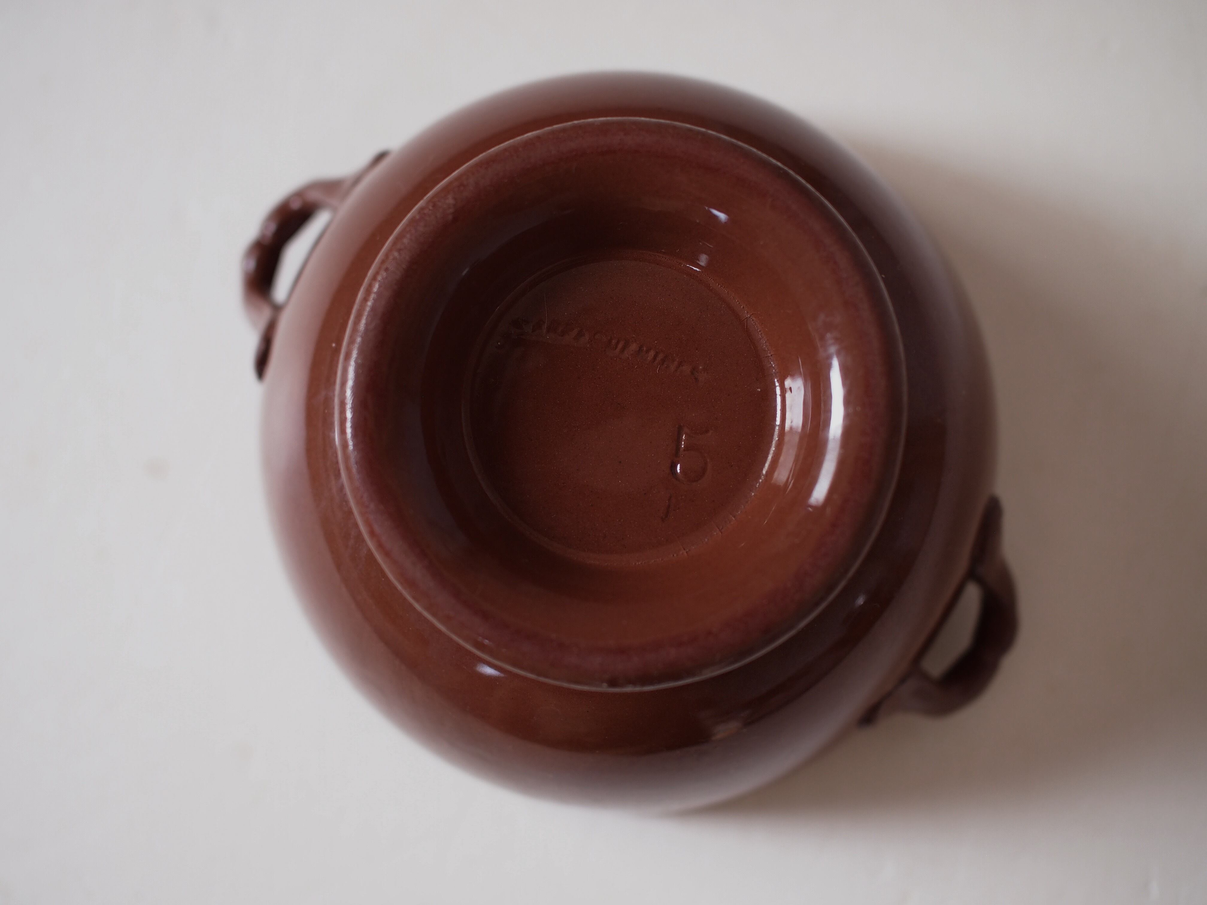 内側には、製造時にできたと思われるぽつぽつや、大小の染みが見られます。外側にも微かな汚れはあるものの、チップやクラックは無く、艶もあります。