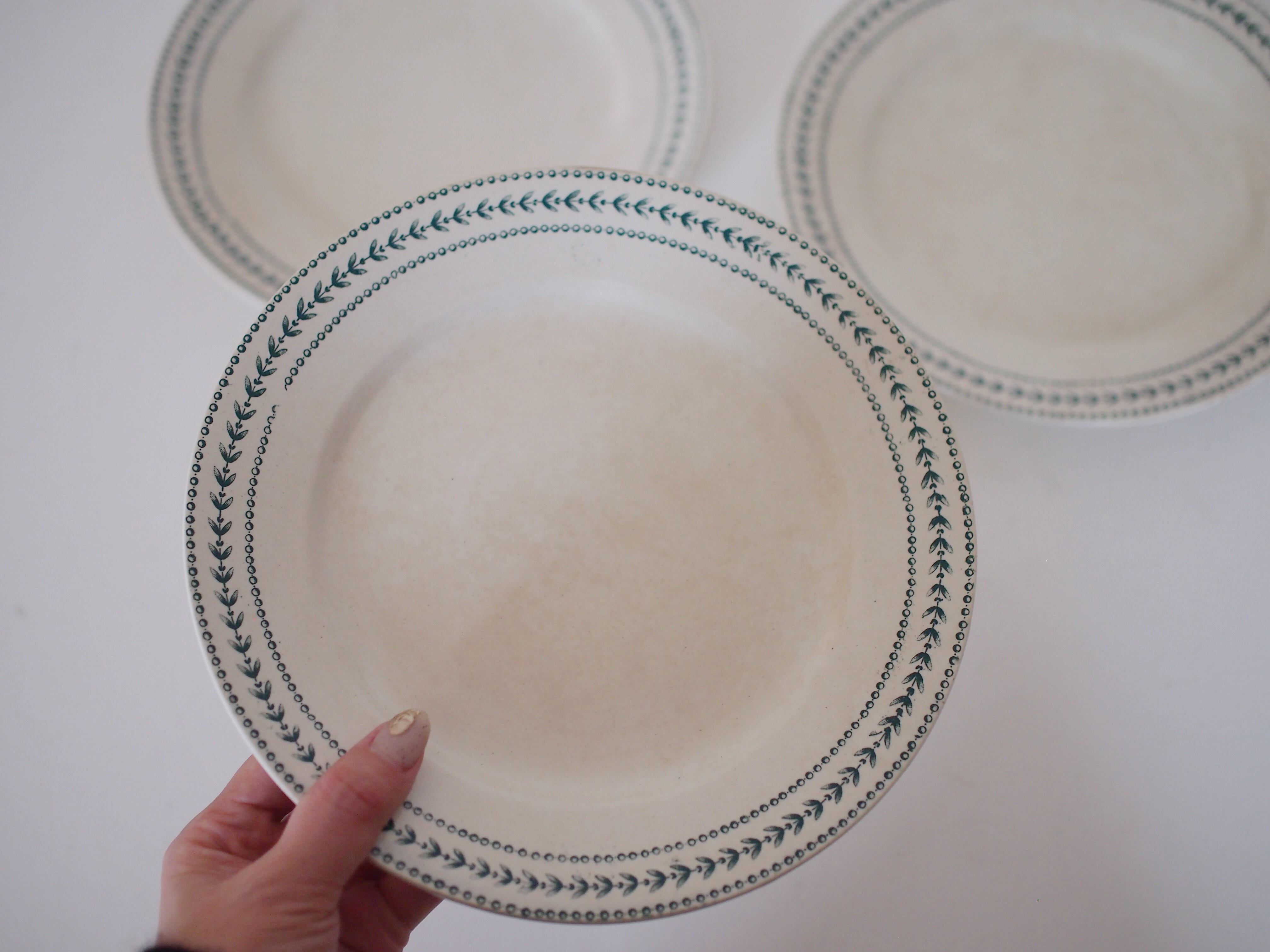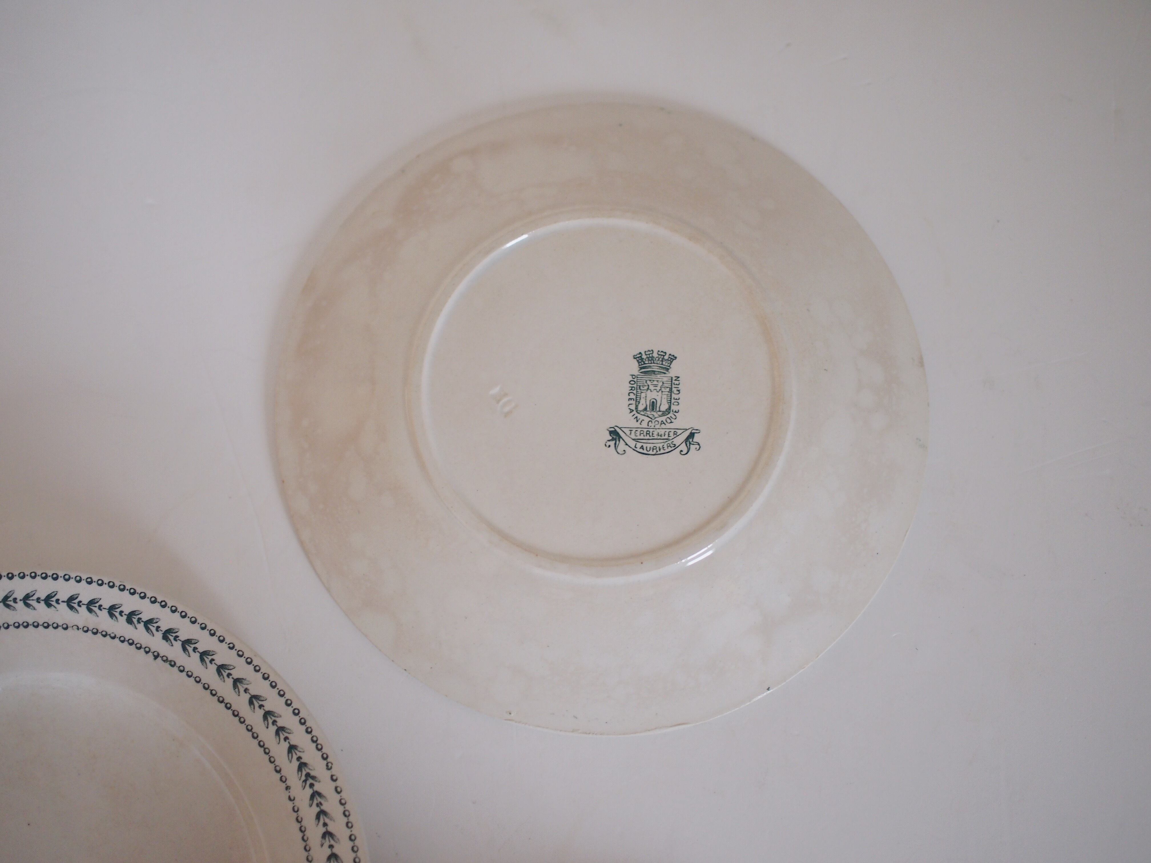 " Lauriers " というシリーズ。オフホワイトのテールドフェール(半陶半磁器)にグリーンの小さなローリエが規則的に描かれています。上品で控えめな絵柄ですので、さりげなくお料理を引き立ててくれます。