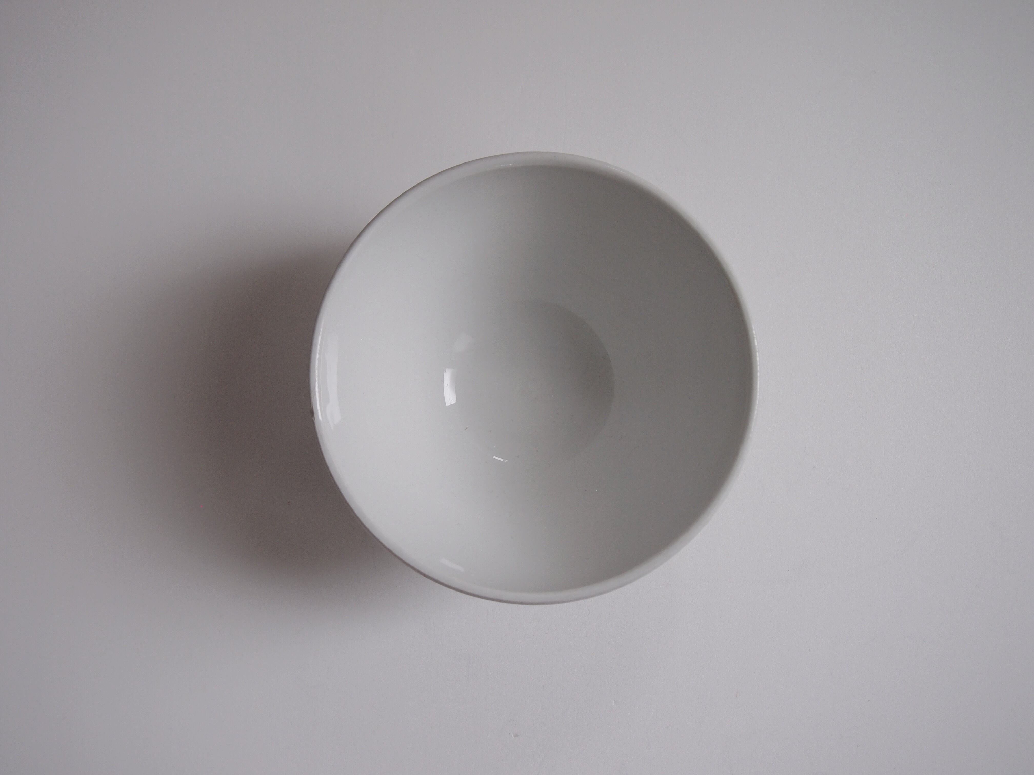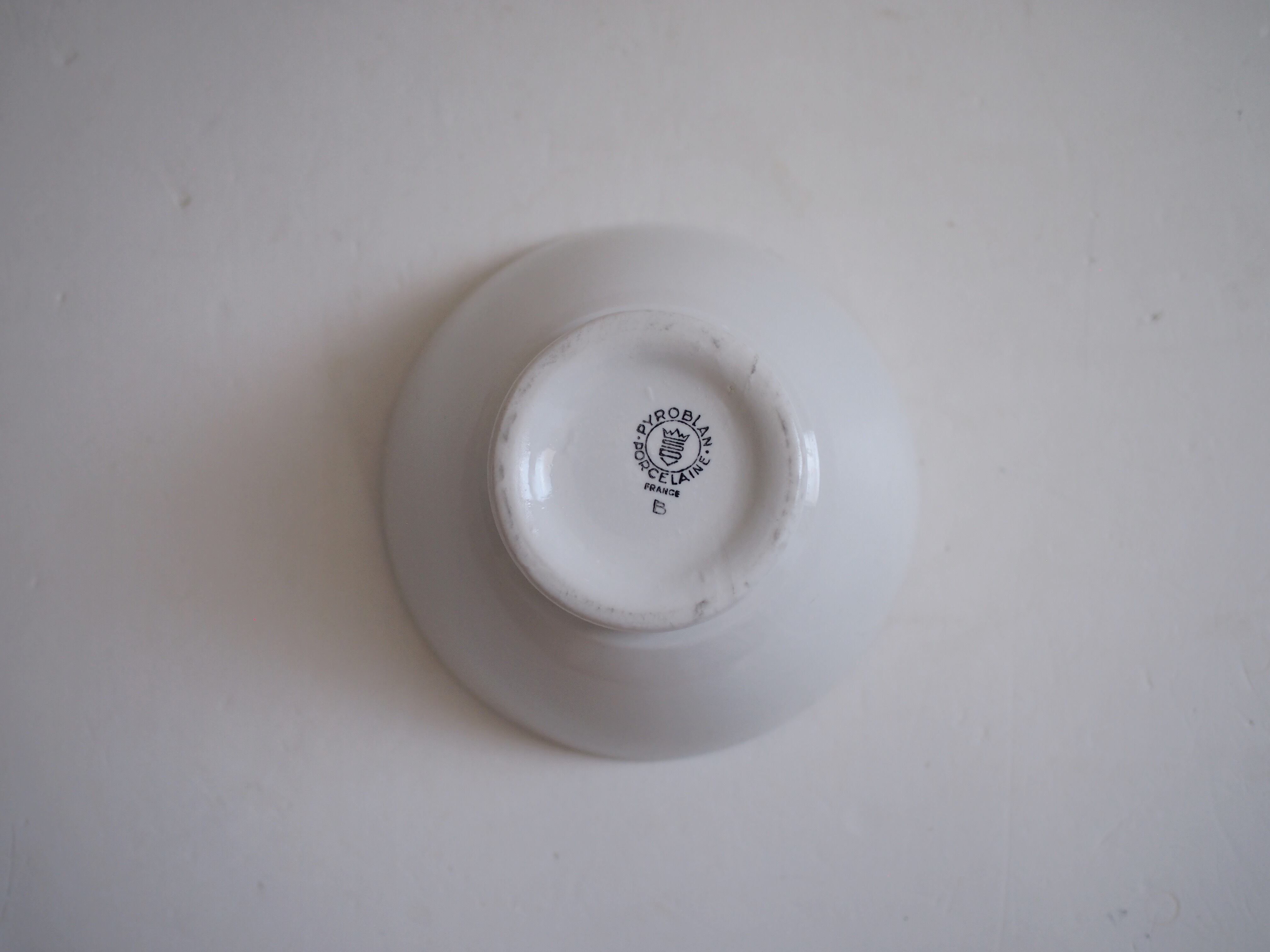フランス sarreguemines (サルグミンヌ) の白いカフェオレボウル。1968年にサルグミンヌが開発した「PYROBLAN」というシリーズ。厚みがありしっかりとしているため、カフェやビストロ、企業の食堂など頻繁に使用される場所で使われていたそう。