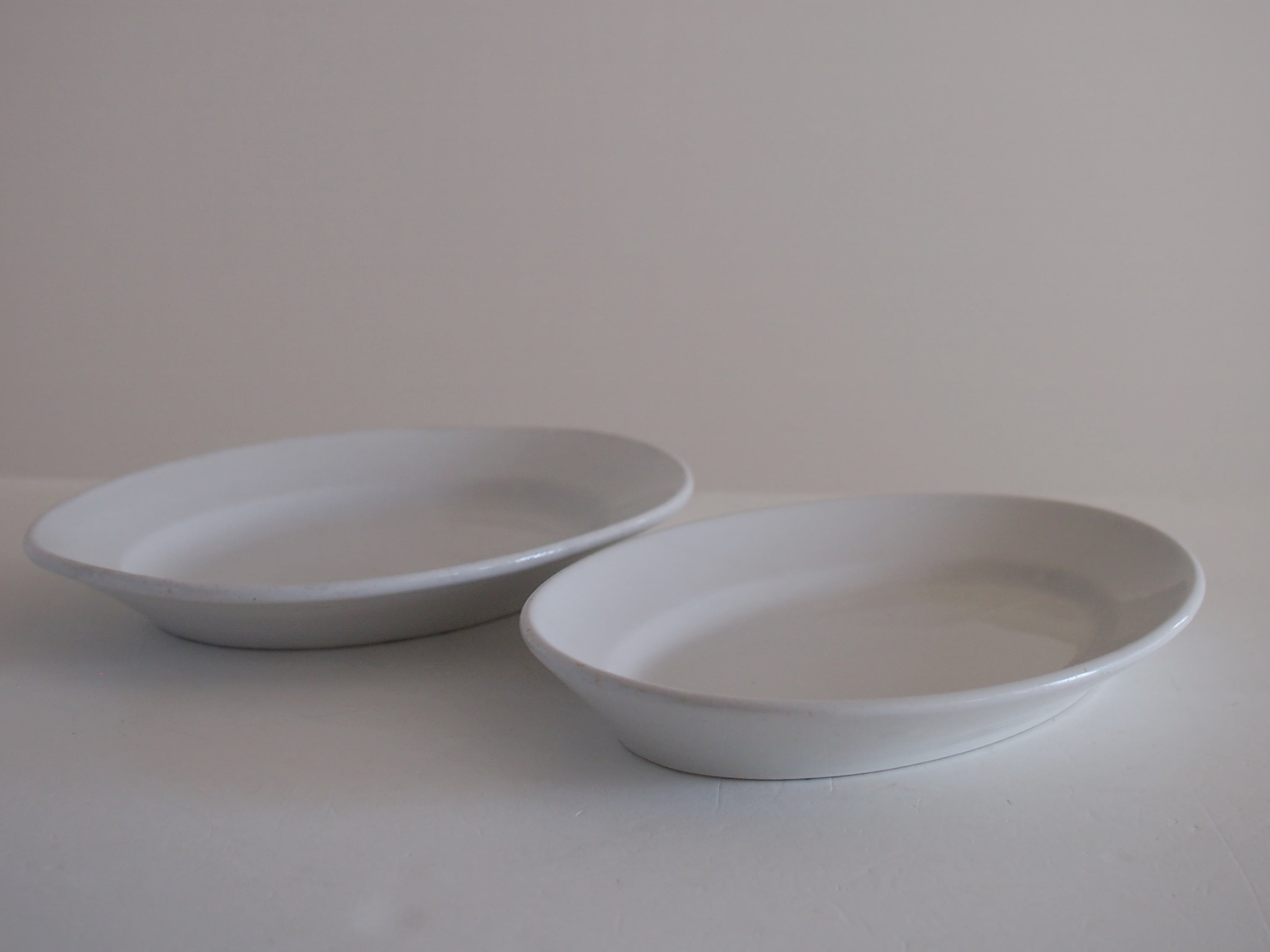 ぽってりとした白い地厚のオーバルプレート。ビストロ或いは食堂などで使うために作られた厚みのある丈夫なつくりです。窯元は不明。