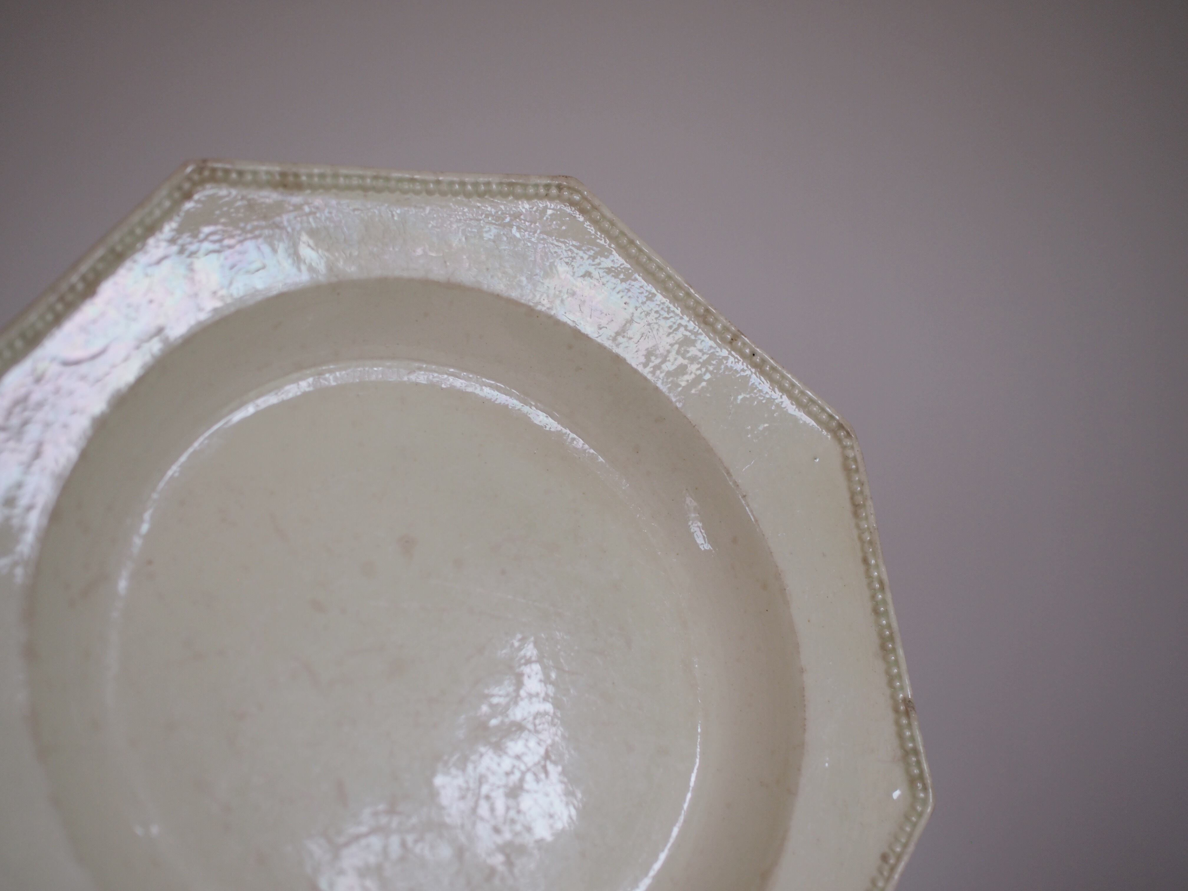 古き時代のクリームウェアらしい象牙色の肌は、しっとりとなめらかで落ち着いた艶があり、凛とした空気を纏っています。鉛釉がほどこされており、美しい虹色の反射がございます。