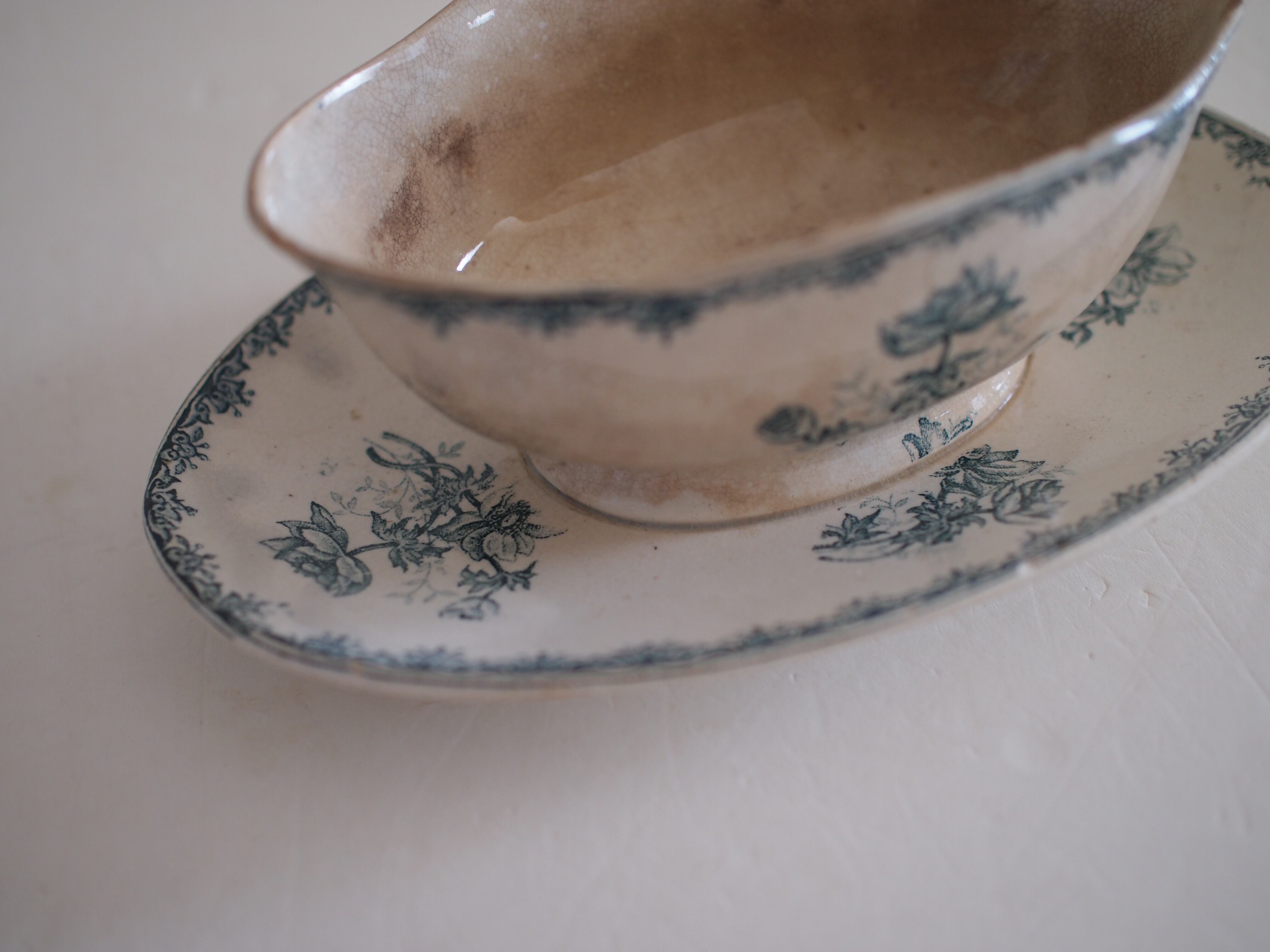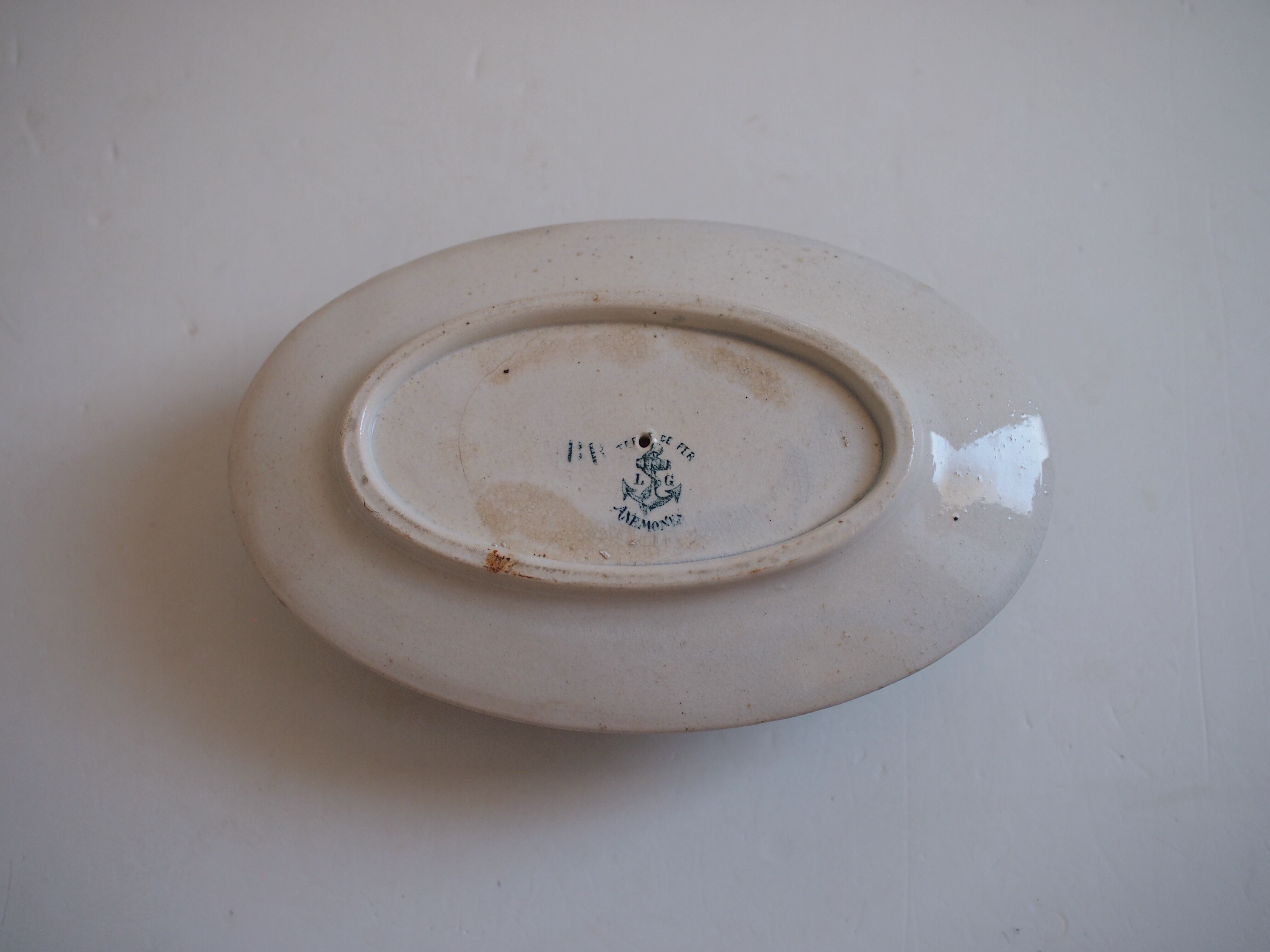 南フランスの蚤の市で見つけたソーシエール。ANEMONEというシリーズで、象牙色の肌に落ち着いた碧色でアネモネの花が描かれています。全体に貫入や染みがあり、アンティークらしい佇まいの器です。