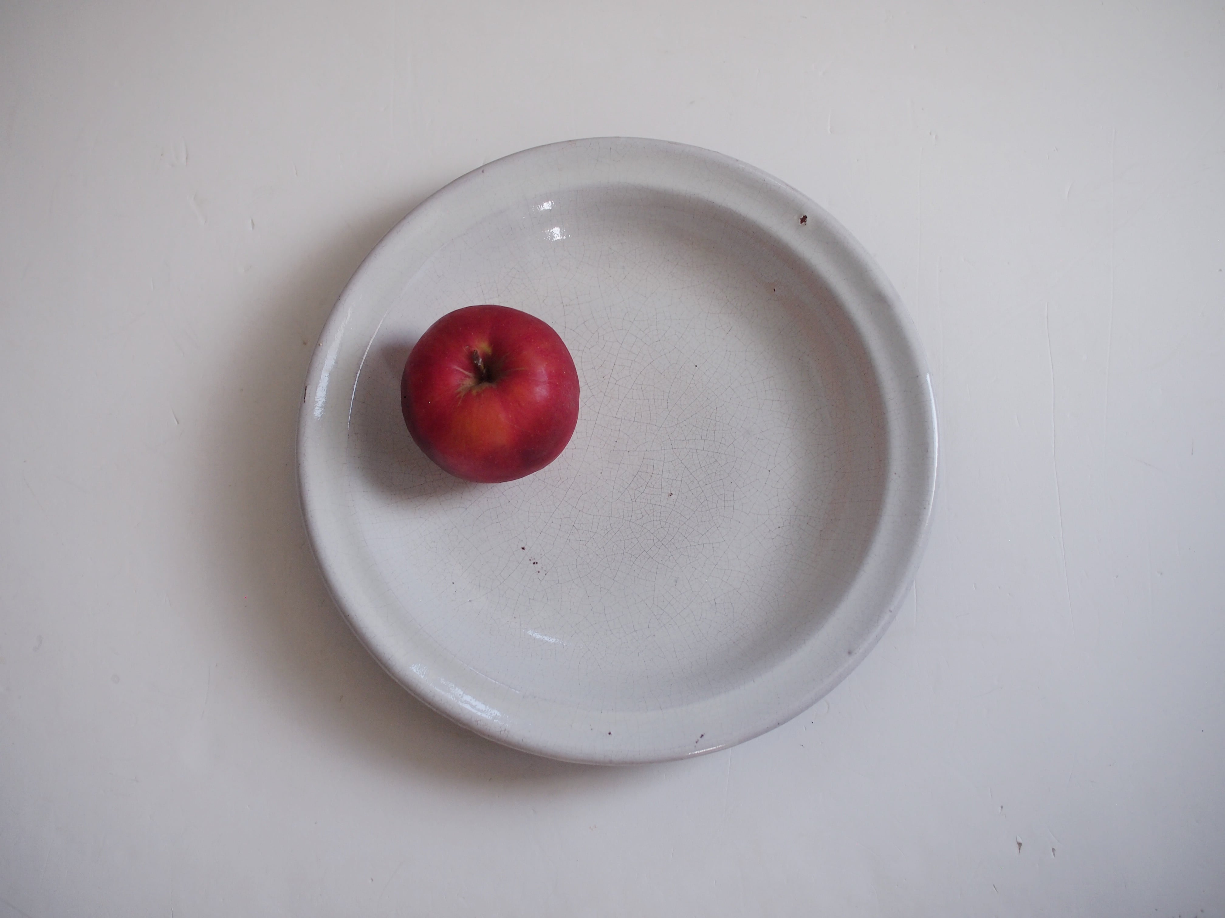 比較的浅めの作りで平べったい印象。灰白色の釉薬がかかった見込み部分には細かな貫入が入っています。