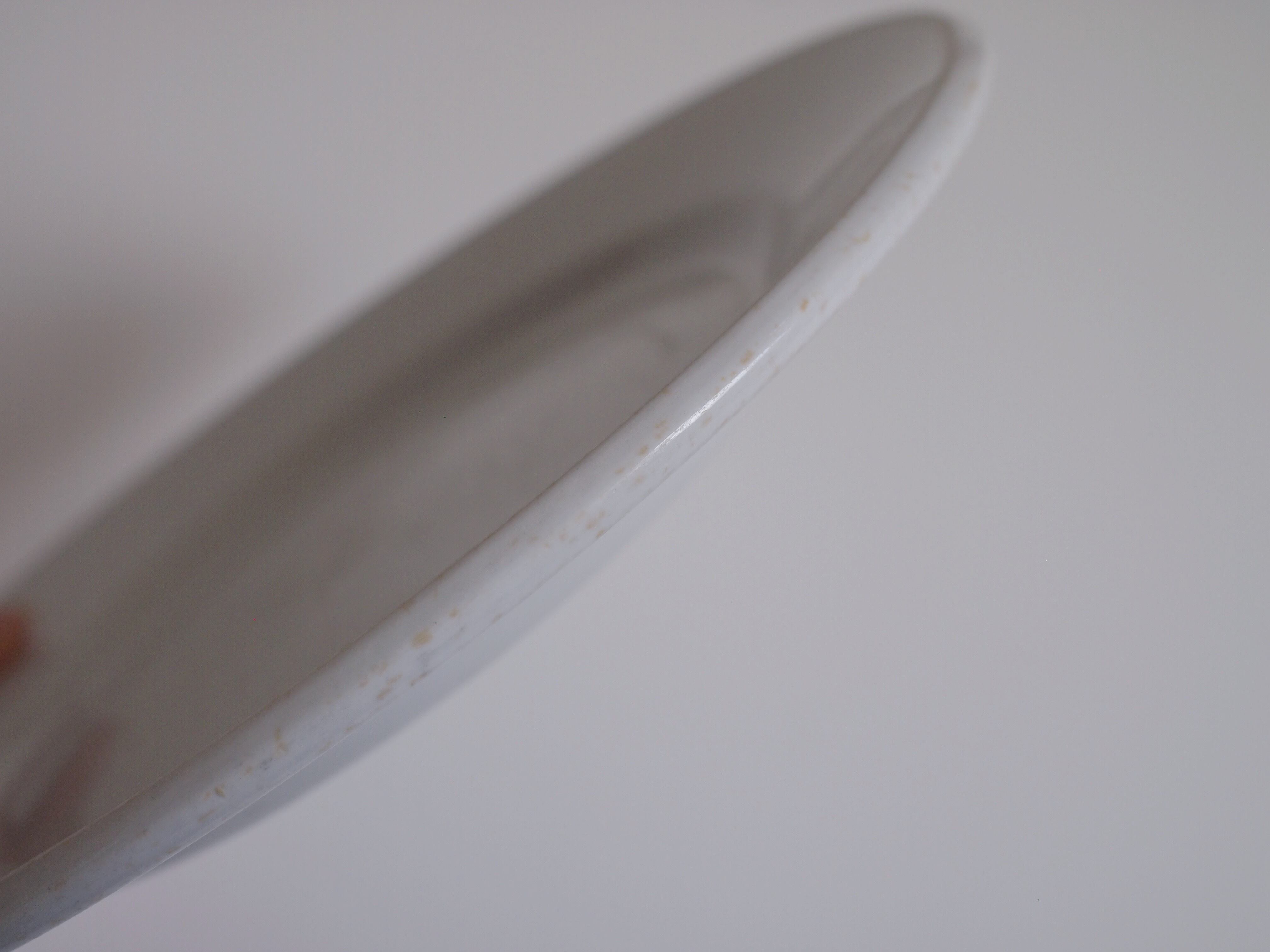 エッジにぽつぽつと染まりが見られますが、この枯れた雰囲気がたまらない!と、むしろそこを気に入って買い付けました。見込み部分には染まりが無いので清潔感もあります。普通は見込みに染みがありエッジは綺麗...というものが多いのですが、こちらはなぜか逆なんです。あまり見ない育ち方をしているお皿です。